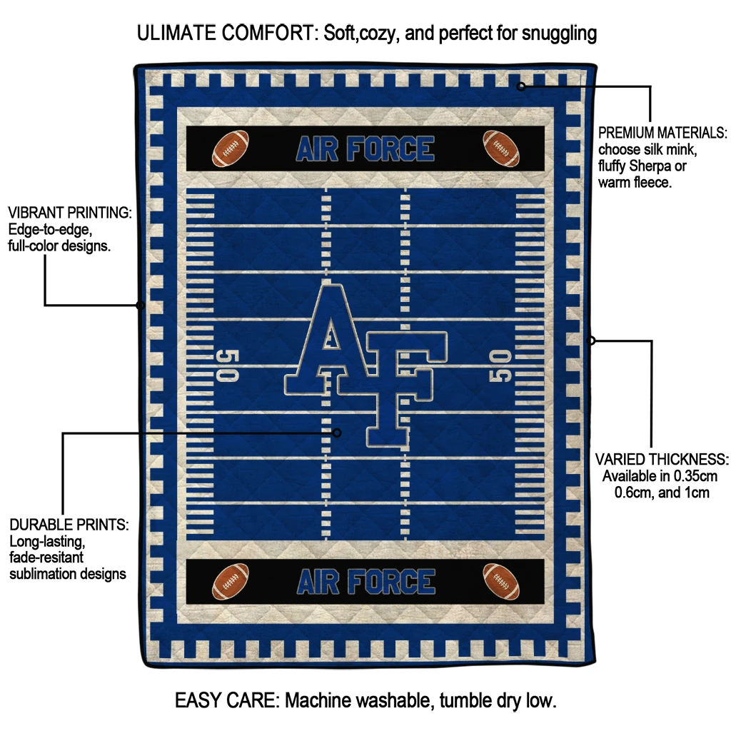 The Air Force Falcons Mickey Player Blue Quilt Blanket is more than a blanket—it’s everyday comfort, thoughtfully made. Crafted from premium quilting fabric with a soft microfiber touch, it offers a smooth hand-feel and lasting coziness. Layered quilting with a cotton-filled core provides adaptable warmth across seasons while maintaining a clean, tailored look on your bed or sofa.