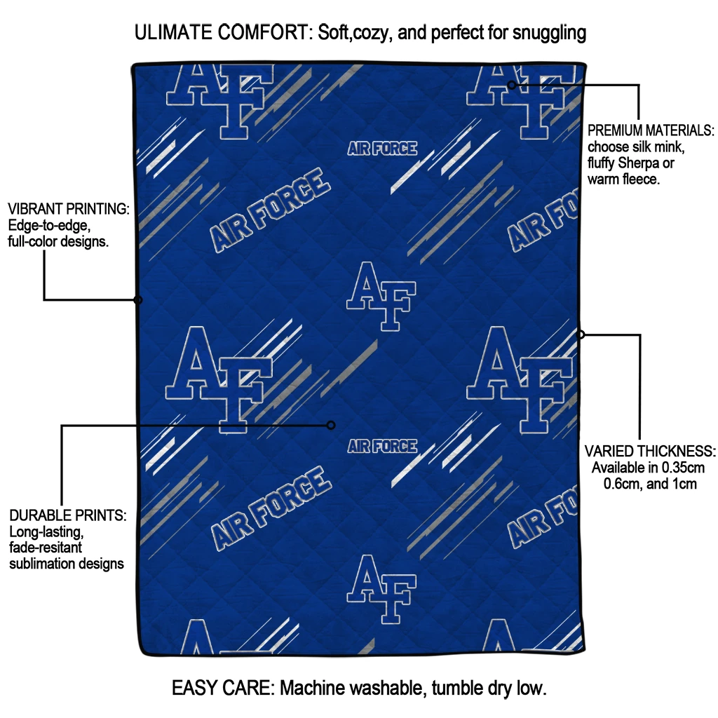The Air Force Falcons Sketch Lines Blue Quilt Blanket is more than a blanket—it’s everyday comfort, thoughtfully made. Crafted from premium quilting fabric with a soft microfiber touch, it offers a smooth hand-feel and lasting coziness. Layered quilting with a cotton-filled core provides adaptable warmth across seasons while maintaining a clean, tailored look on your bed or sofa.