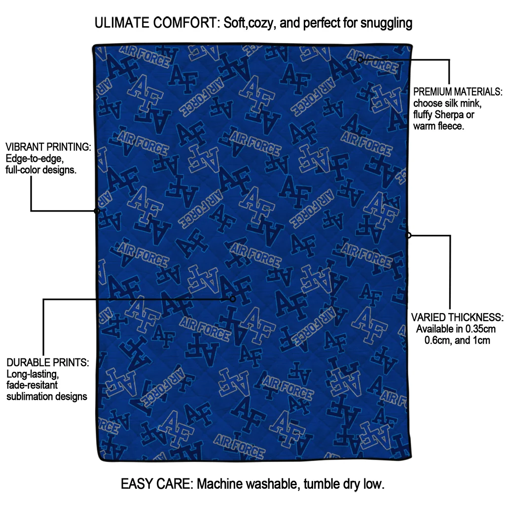 Wrap yourself in warmth and pride with the Air Force Falcons Solid Classic Blue Quilt Blanket from the Air Force Falcons Blankets collection at Yes That Blanket. Made from 100% premium quilting-weight polyester blended with a touch of microfiber, this quilt offers a smooth, soft finish you’ll love. Choose between two quilting styles—Stipple or Diagonal—and enjoy the comfort of a cotton-filled layer inside that adds extra coziness for every season. The border is available in classic black or white, giving your design a clean, timeless edge.
