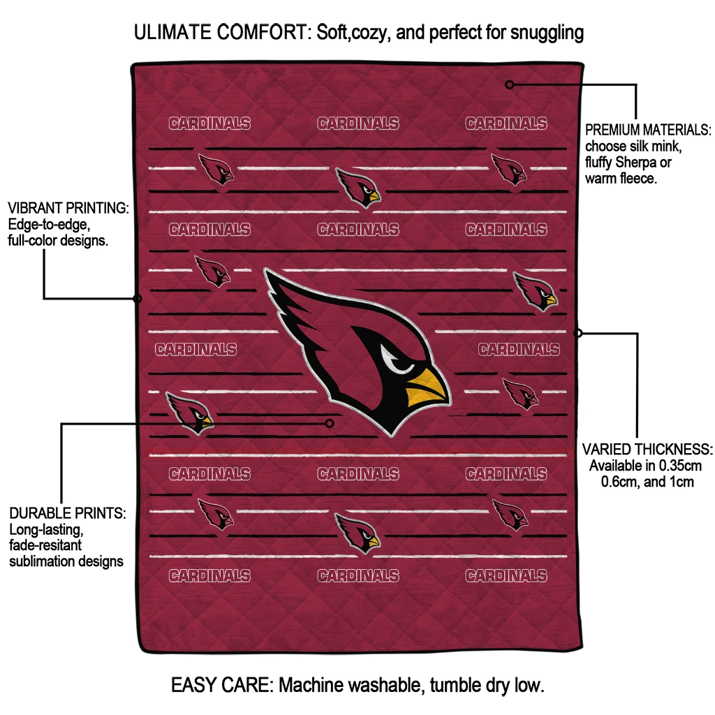 Wrap yourself in warmth and pride with the Arizona Cardinals Handdrawn Stripes Red Quilt Blanket from the Arizona Cardinals Blankets collection at Yes That Blanket. Made from 100% premium quilting-weight polyester blended with a touch of microfiber, this quilt offers a smooth, soft finish you’ll love. Choose between two quilting styles—Stipple or Diagonal—and enjoy the comfort of a cotton-filled layer inside that adds extra coziness for every season. The border is available in classic black or white, giving your design a clean, timeless edge.