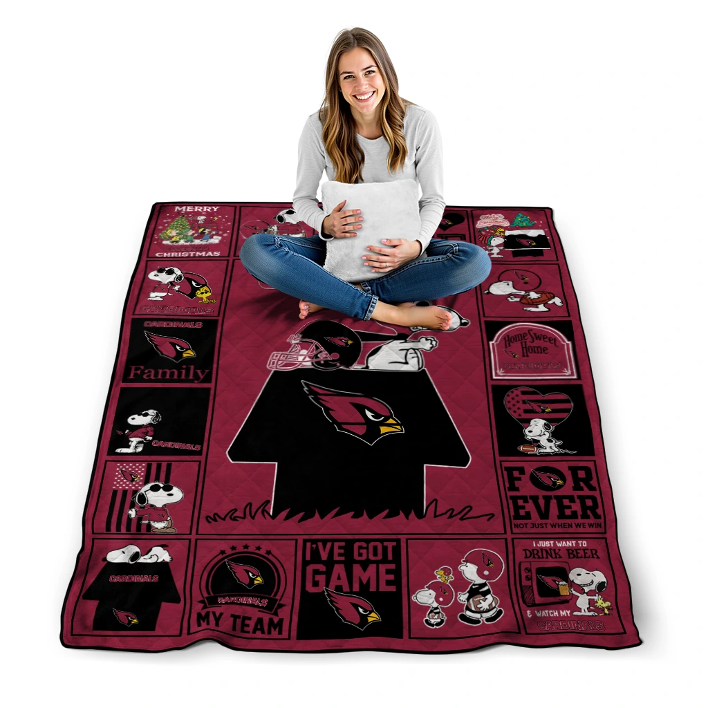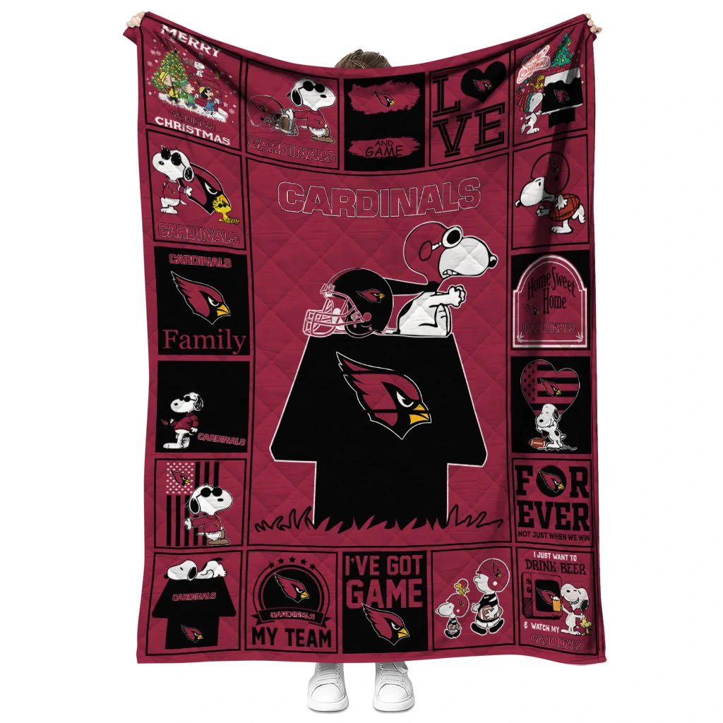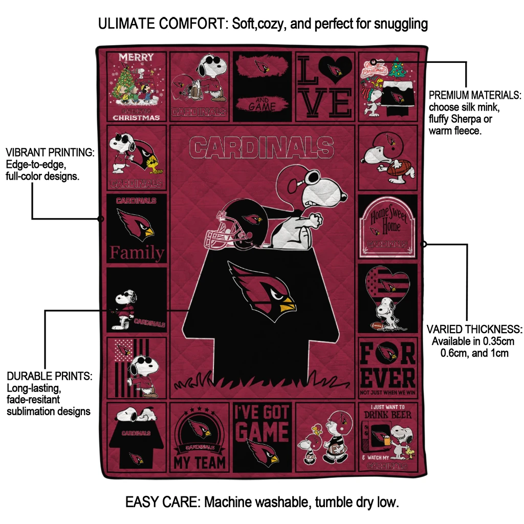 Wrap yourself in warmth and pride with the Arizona Cardinals Snoopy Love Red Quilt Blanket from the Arizona Cardinals Blankets collection at Yes That Blanket. Made from 100% premium quilting-weight polyester blended with a touch of microfiber, this quilt offers a smooth, soft finish you’ll love. Choose between two quilting styles—Stipple or Diagonal—and enjoy the comfort of a cotton-filled layer inside that adds extra coziness for every season. The border is available in classic black or white, giving your design a clean, timeless edge.