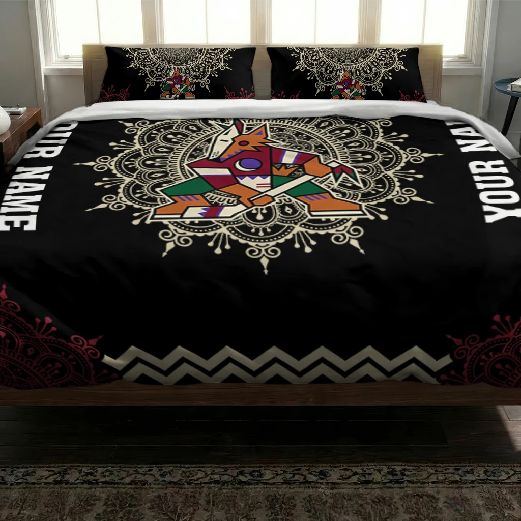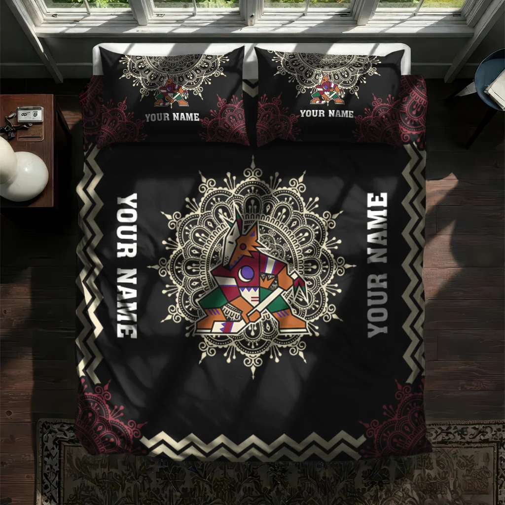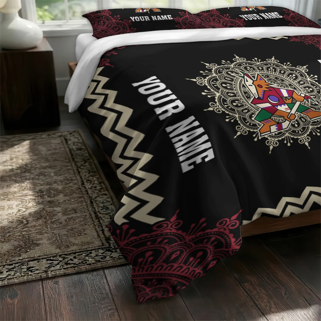 Arizona Coyotes Bedding Set – Personalized Mandala Lacework Black Beige