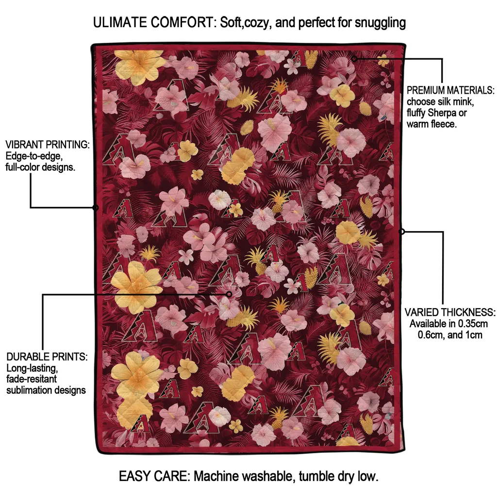 Wrap yourself in warmth and pride with the Arizona Diamondbacks Hibiscus Foliage Red Quilt Blanket from the Arizona Diamondbacks Blankets collection at Yes That Blanket. Made from 100% premium quilting-weight polyester blended with a touch of microfiber, this quilt offers a smooth, soft finish you’ll love. Choose between two quilting styles—Stipple or Diagonal—and enjoy the comfort of a cotton-filled layer inside that adds extra coziness for every season. The border is available in classic black or white, giving your design a clean, timeless edge.