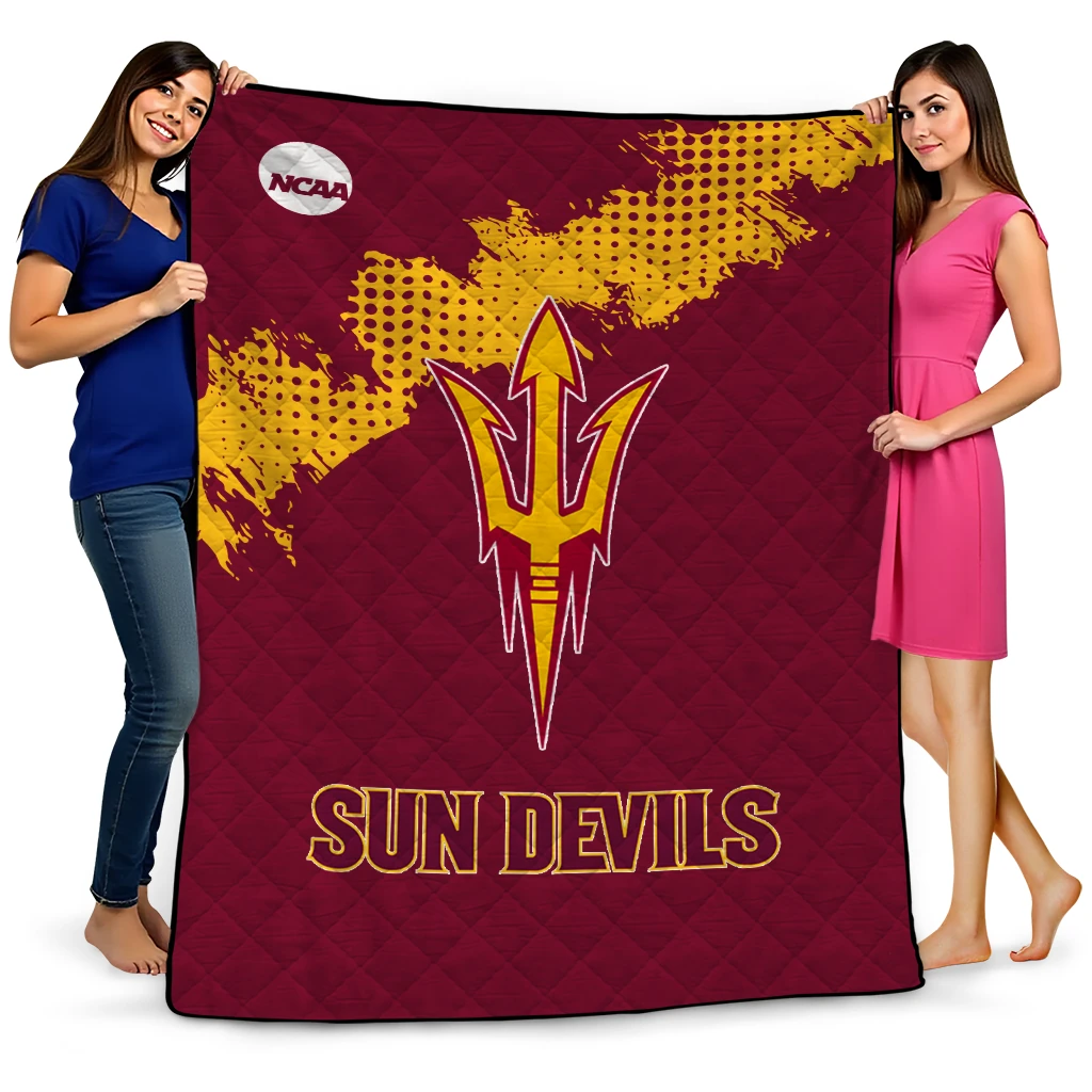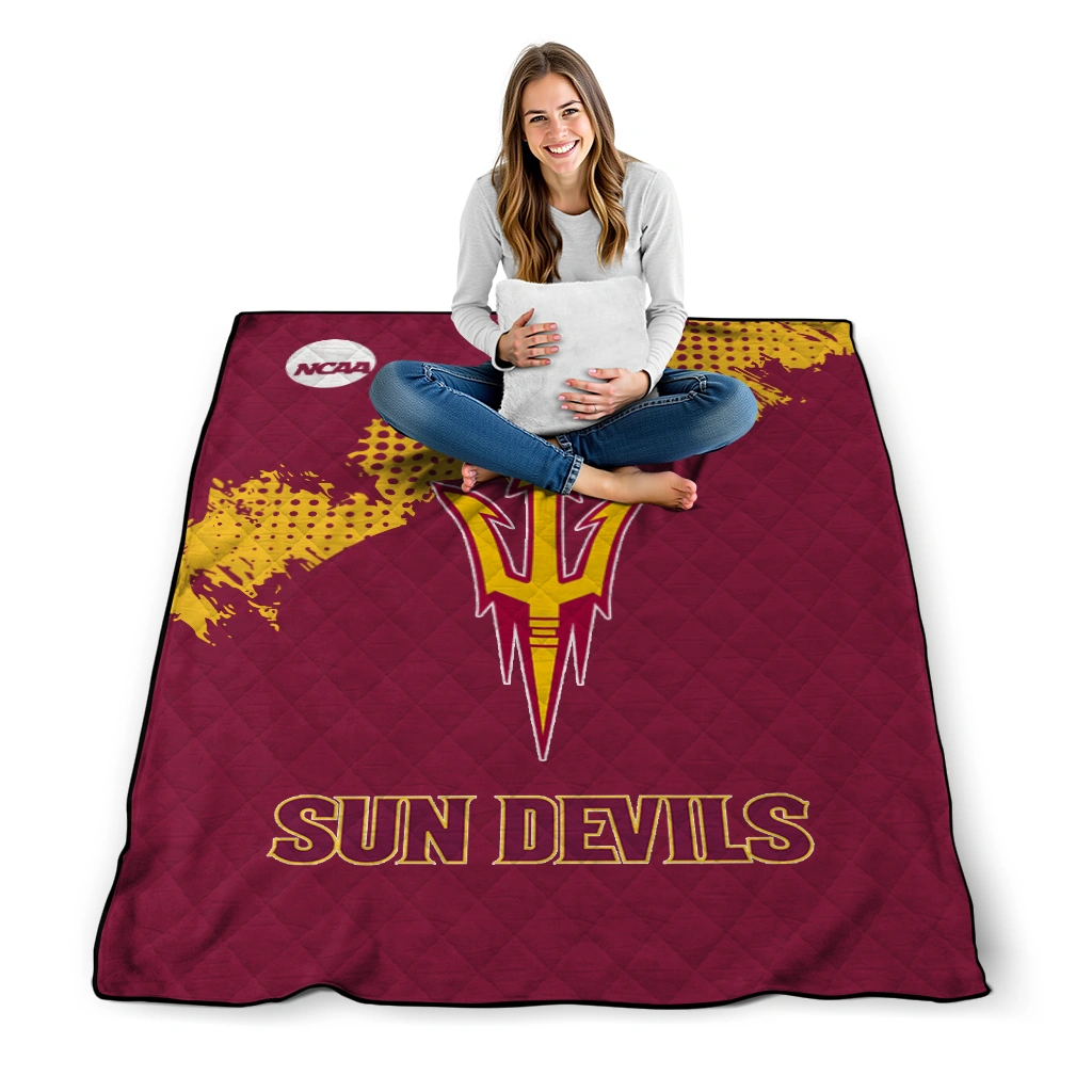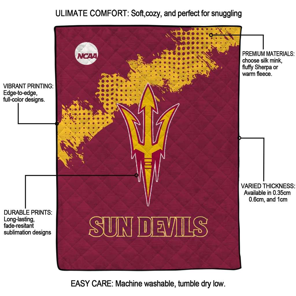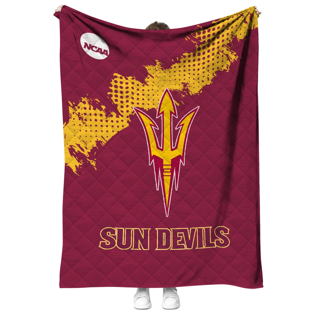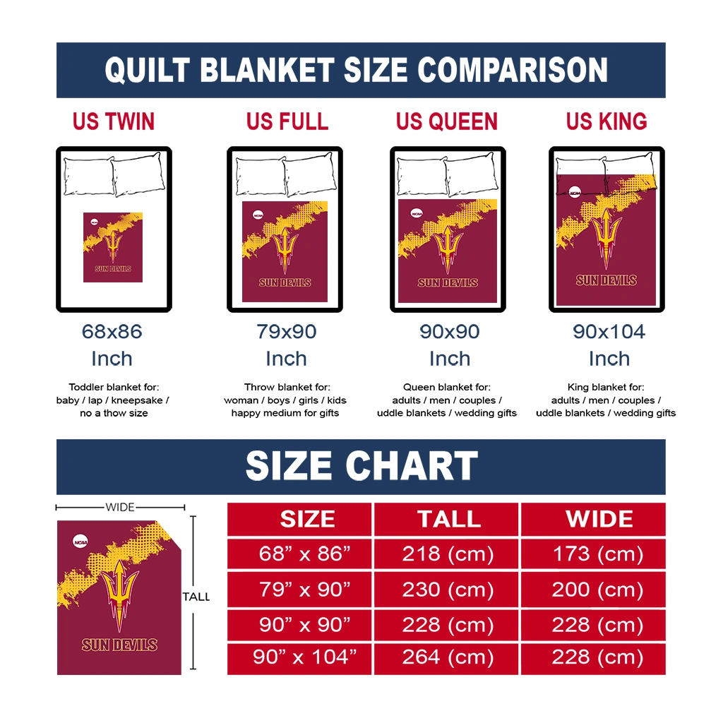 Wrap yourself in warmth and pride with the Arizona State Sun Devils Paint Trail Maroon Quilt Blanket from the Arizona State Sun Devils Blankets collection at Yes That Blanket. Made from 100% premium quilting-weight polyester blended with a touch of microfiber, this quilt offers a smooth, soft finish you’ll love. Choose between two quilting styles—Stipple or Diagonal—and enjoy the comfort of a cotton-filled layer inside that adds extra coziness for every season. The border is available in classic black or white, giving your design a clean, timeless edge.