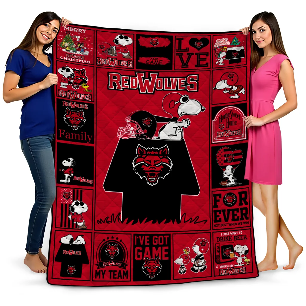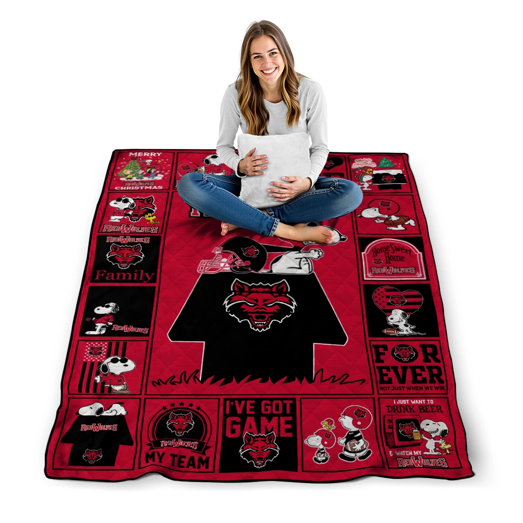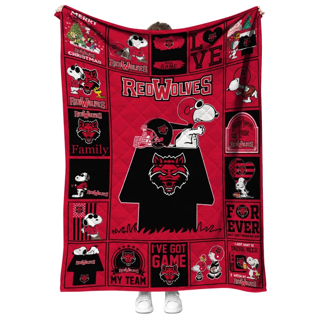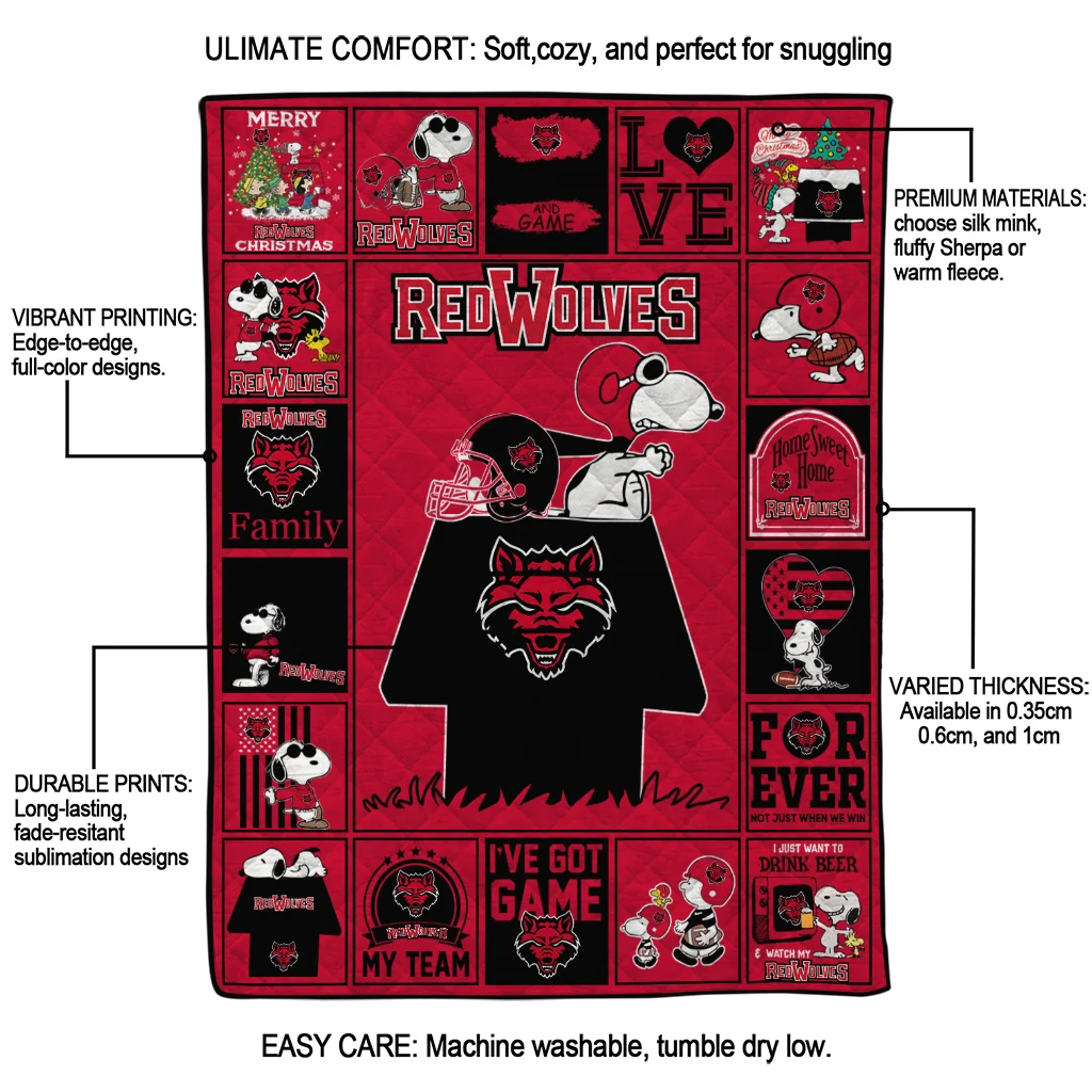 Wrap yourself in warmth and pride with the Arkansas State Red Wolves Snoopy Love Scarlet Quilt Blanket from the Arkansas State Red Wolves Blankets collection at Yes That Blanket. Made from 100% premium quilting-weight polyester blended with a touch of microfiber, this quilt offers a smooth, soft finish you’ll love. Choose between two quilting styles—Stipple or Diagonal—and enjoy the comfort of a cotton-filled layer inside that adds extra coziness for every season. The border is available in classic black or white, giving your design a clean, timeless edge.