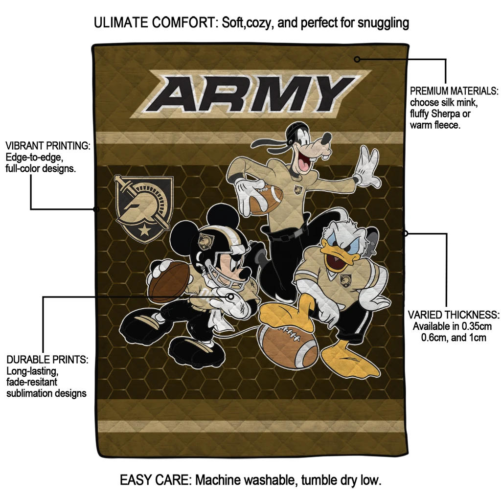 The Army Black Knights Disney Football Gold Quilt Blanket is more than a blanket—it’s everyday comfort, thoughtfully made. Crafted from premium quilting fabric with a soft microfiber touch, it offers a smooth hand-feel and lasting coziness. Layered quilting with a cotton-filled core provides adaptable warmth across seasons while maintaining a clean, tailored look on your bed or sofa.