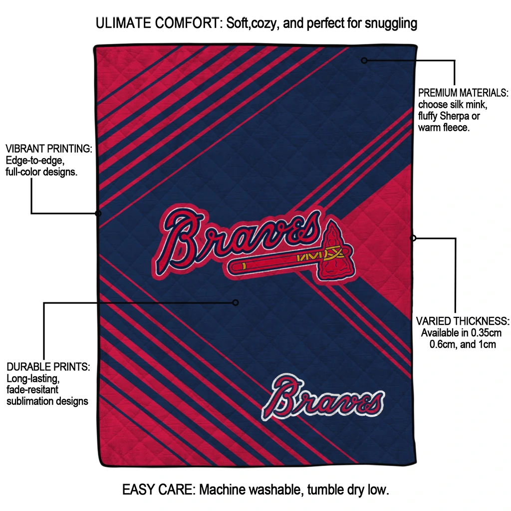Wrap yourself in warmth and pride with the Atlanta Braves Arrow Layers Navy Quilt Blanket from the Atlanta Braves Blankets collection at Yes That Blanket. Made from 100% premium quilting-weight polyester blended with a touch of microfiber, this quilt offers a smooth, soft finish you’ll love. Choose between two quilting styles—Stipple or Diagonal—and enjoy the comfort of a cotton-filled layer inside that adds extra coziness for every season. The border is available in classic black or white, giving your design a clean, timeless edge.