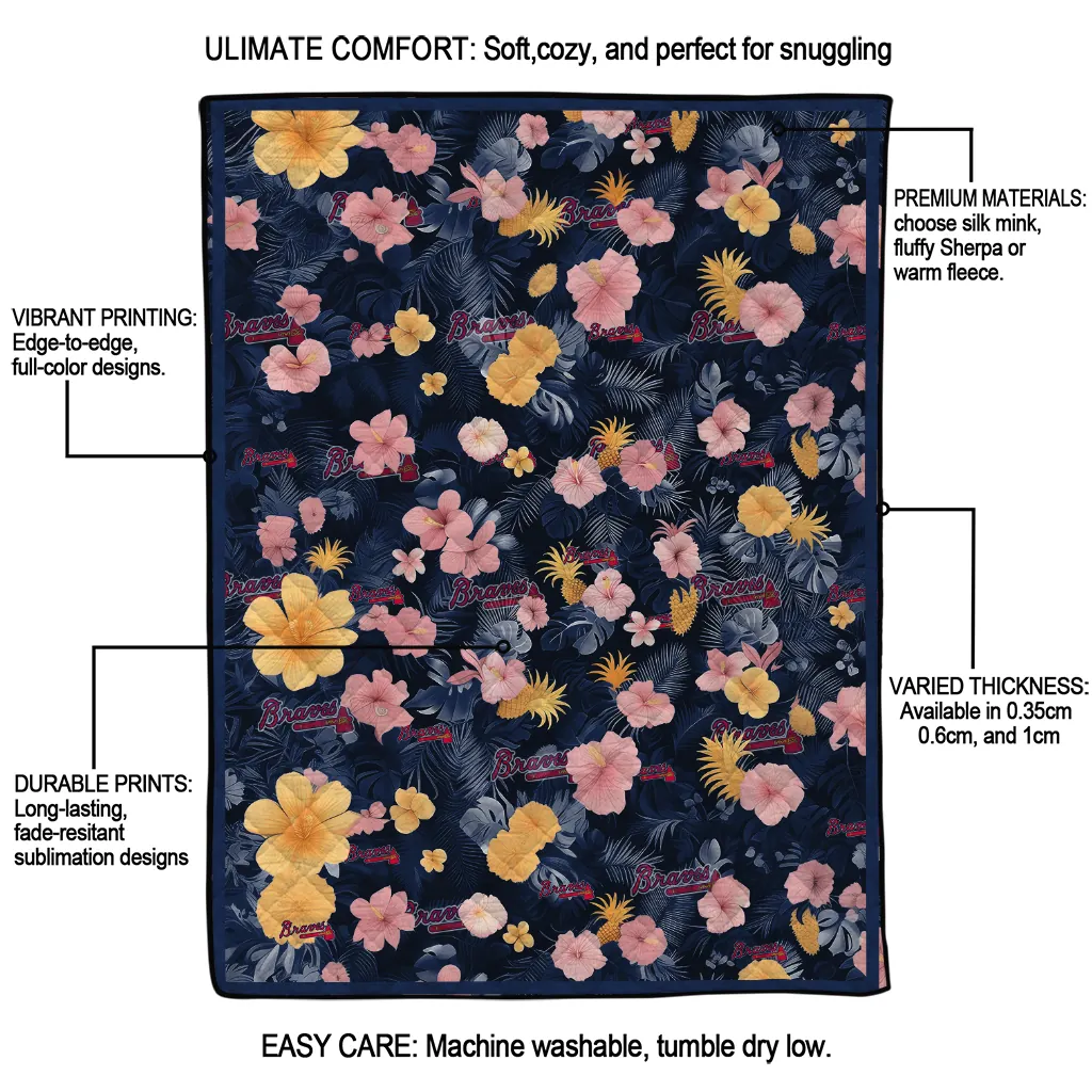 Wrap yourself in warmth and pride with the Atlanta Braves Hibiscus Foliage Navy Quilt Blanket from the Atlanta Braves Blankets collection at Yes That Blanket. Made from 100% premium quilting-weight polyester blended with a touch of microfiber, this quilt offers a smooth, soft finish you’ll love. Choose between two quilting styles—Stipple or Diagonal—and enjoy the comfort of a cotton-filled layer inside that adds extra coziness for every season. The border is available in classic black or white, giving your design a clean, timeless edge.