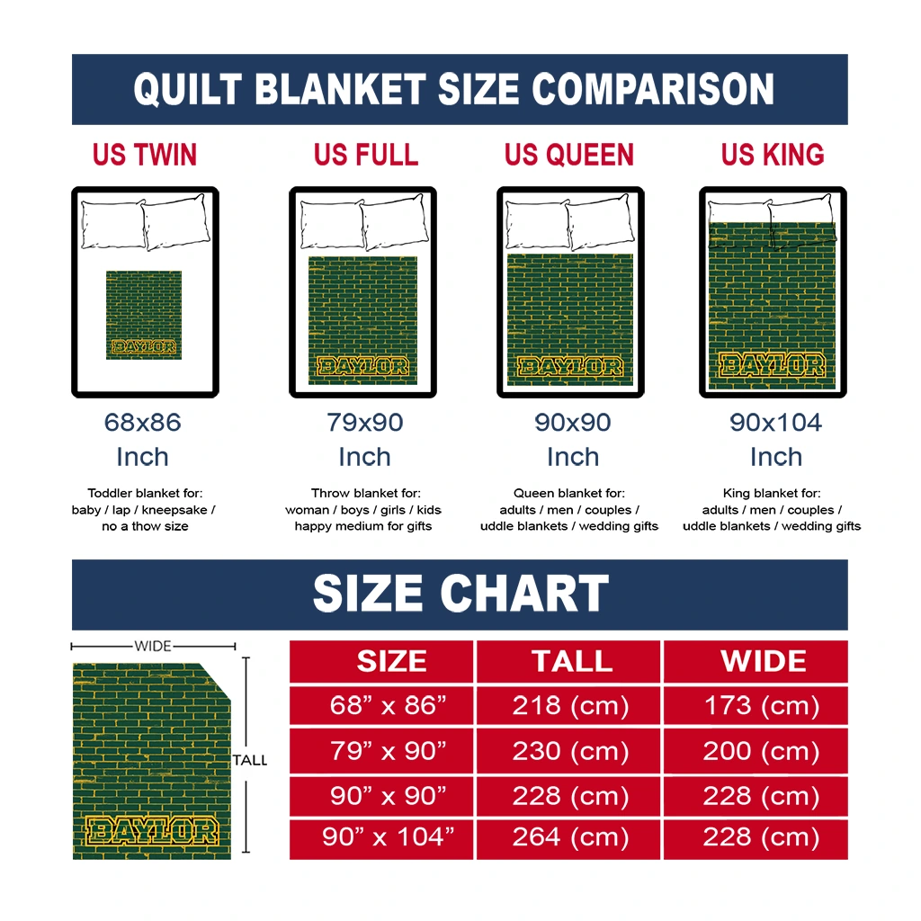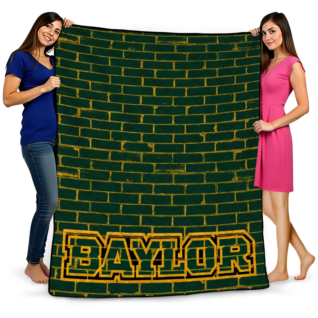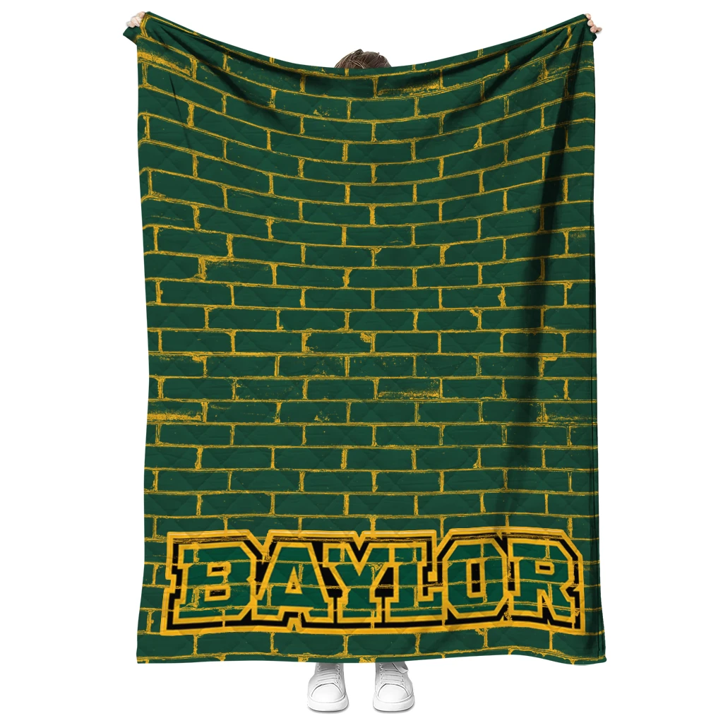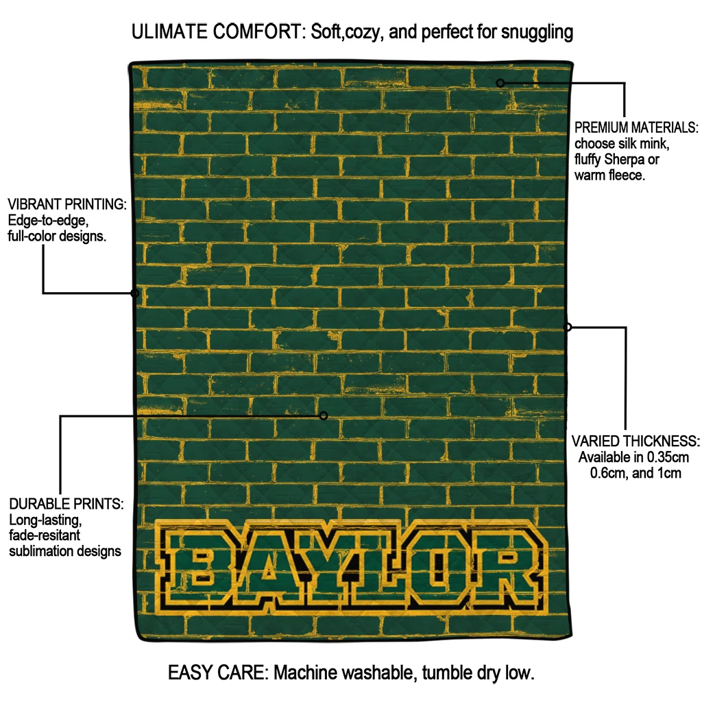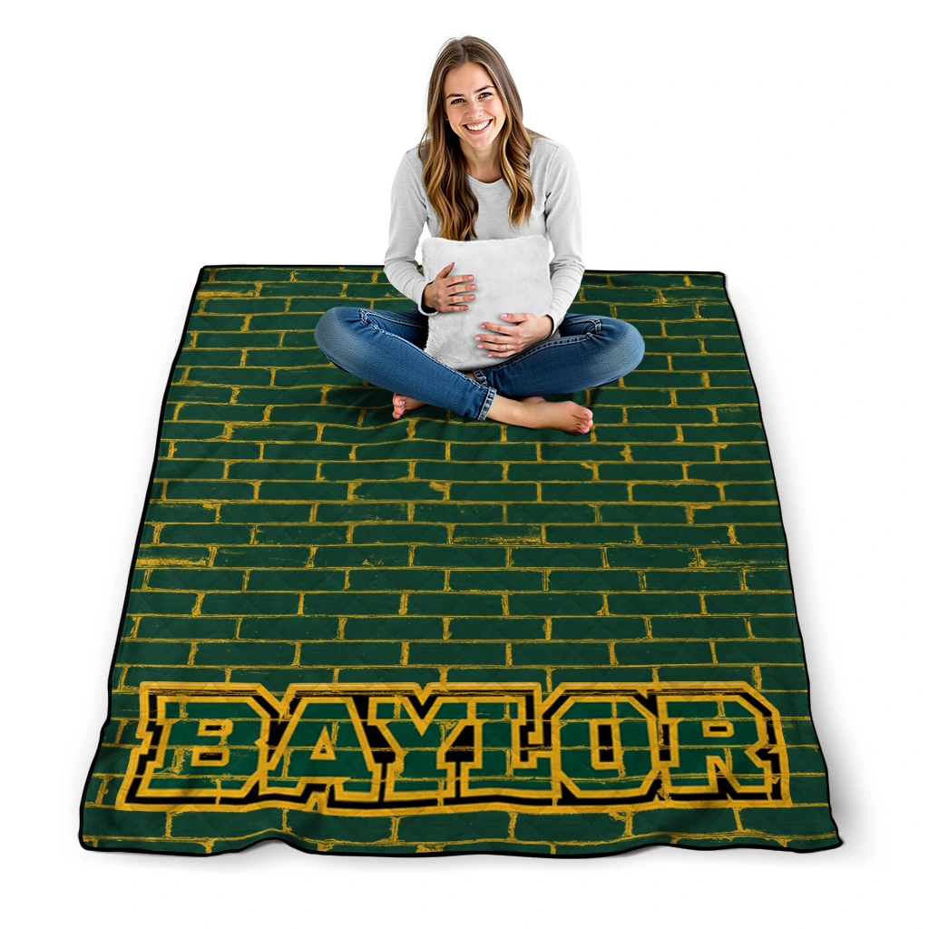 Wrap yourself in warmth and pride with the Baylor Bears Brick Grid Green Quilt Blanket from the Baylor Bears Blankets collection at Yes That Blanket. Made from 100% premium quilting-weight polyester blended with a touch of microfiber, this quilt offers a smooth, soft finish you’ll love. Choose between two quilting styles—Stipple or Diagonal—and enjoy the comfort of a cotton-filled layer inside that adds extra coziness for every season. The border is available in classic black or white, giving your design a clean, timeless edge.