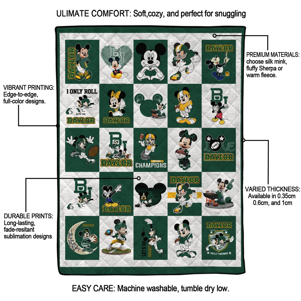 Wrap yourself in warmth and pride with the Baylor Bears Mickey Mouse Motif Green White Quilt Blanket from the Baylor Bears Blankets collection at Yes That Blanket. Made from 100% premium quilting-weight polyester blended with a touch of microfiber, this quilt offers a smooth, soft finish you’ll love. Choose between two quilting styles—Stipple or Diagonal—and enjoy the comfort of a cotton-filled layer inside that adds extra coziness for every season. The border is available in classic black or white, giving your design a clean, timeless edge.