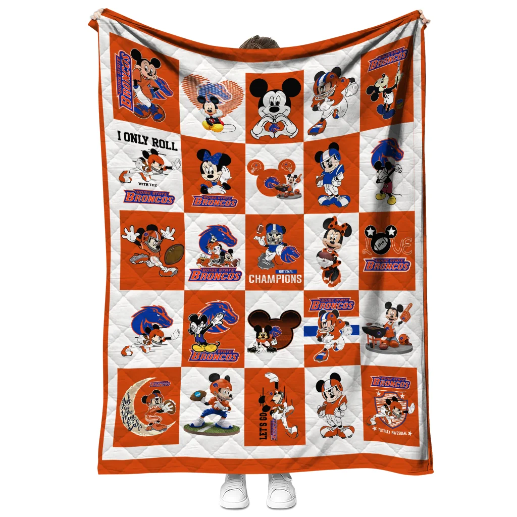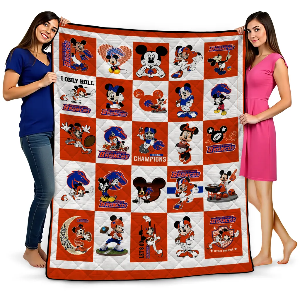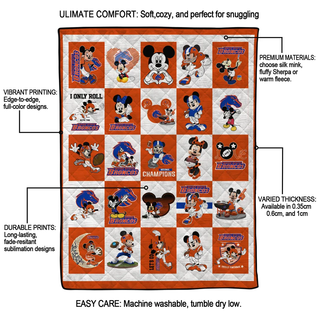 Wrap yourself in warmth and pride with the Boise State Broncos Mickey Mouse Motif Orange White Quilt Blanket from the Boise State Broncos Blankets collection at Yes That Blanket. Made from 100% premium quilting-weight polyester blended with a touch of microfiber, this quilt offers a smooth, soft finish you’ll love. Choose between two quilting styles—Stipple or Diagonal—and enjoy the comfort of a cotton-filled layer inside that adds extra coziness for every season. The border is available in classic black or white, giving your design a clean, timeless edge.