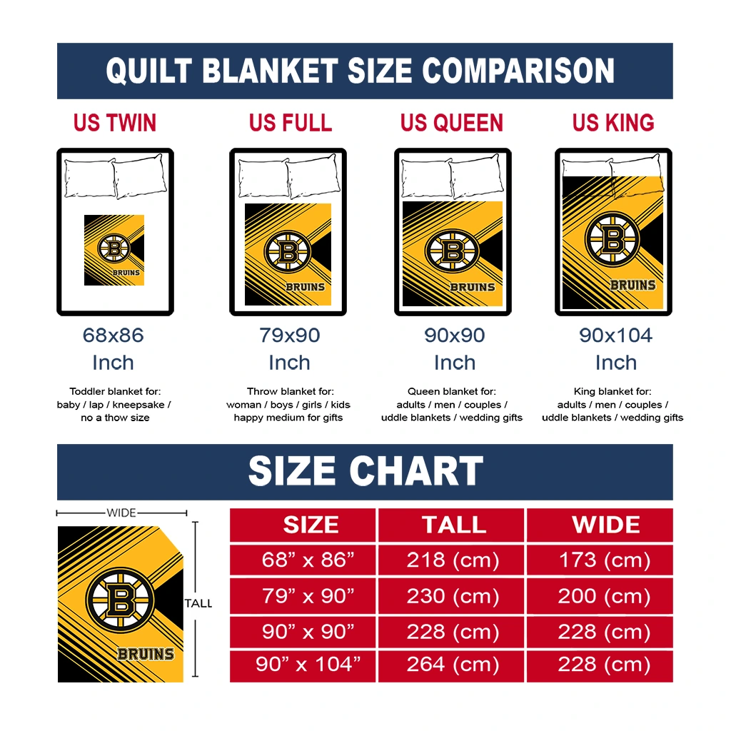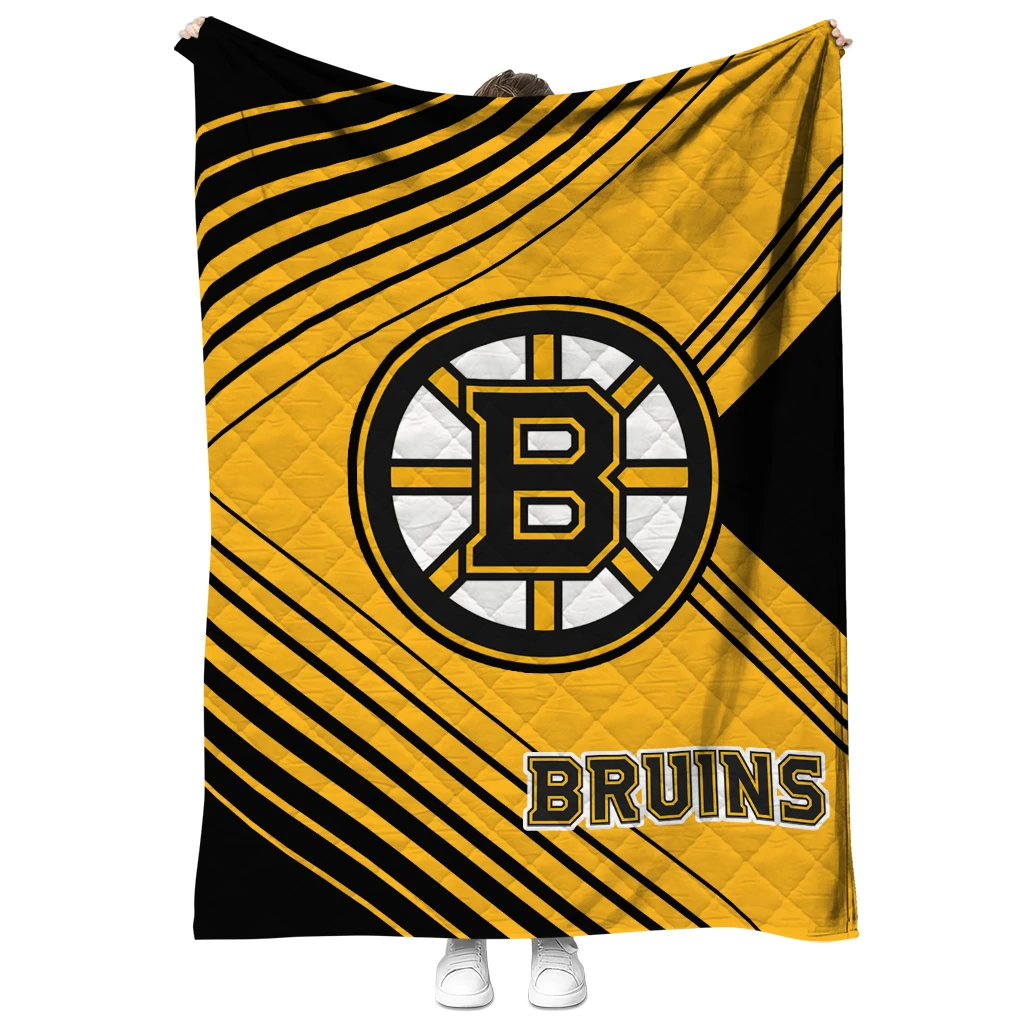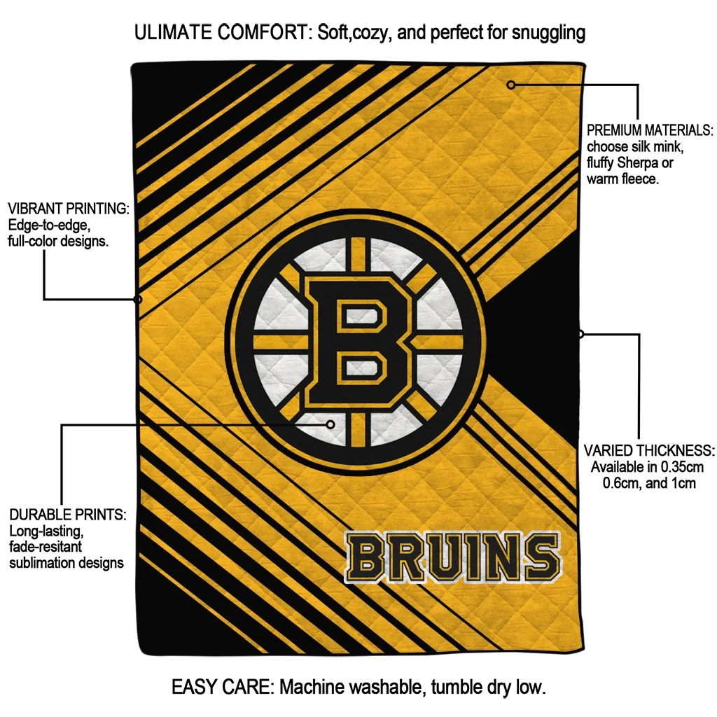 Wrap yourself in warmth and pride with the Boston Bruins Arrow Layers Gold Quilt Blanket from the Boston Bruins Blankets collection at Yes That Blanket. Made from 100% premium quilting-weight polyester blended with a touch of microfiber, this quilt offers a smooth, soft finish you’ll love. Choose between two quilting styles—Stipple or Diagonal—and enjoy the comfort of a cotton-filled layer inside that adds extra coziness for every season. The border is available in classic black or white, giving your design a clean, timeless edge.