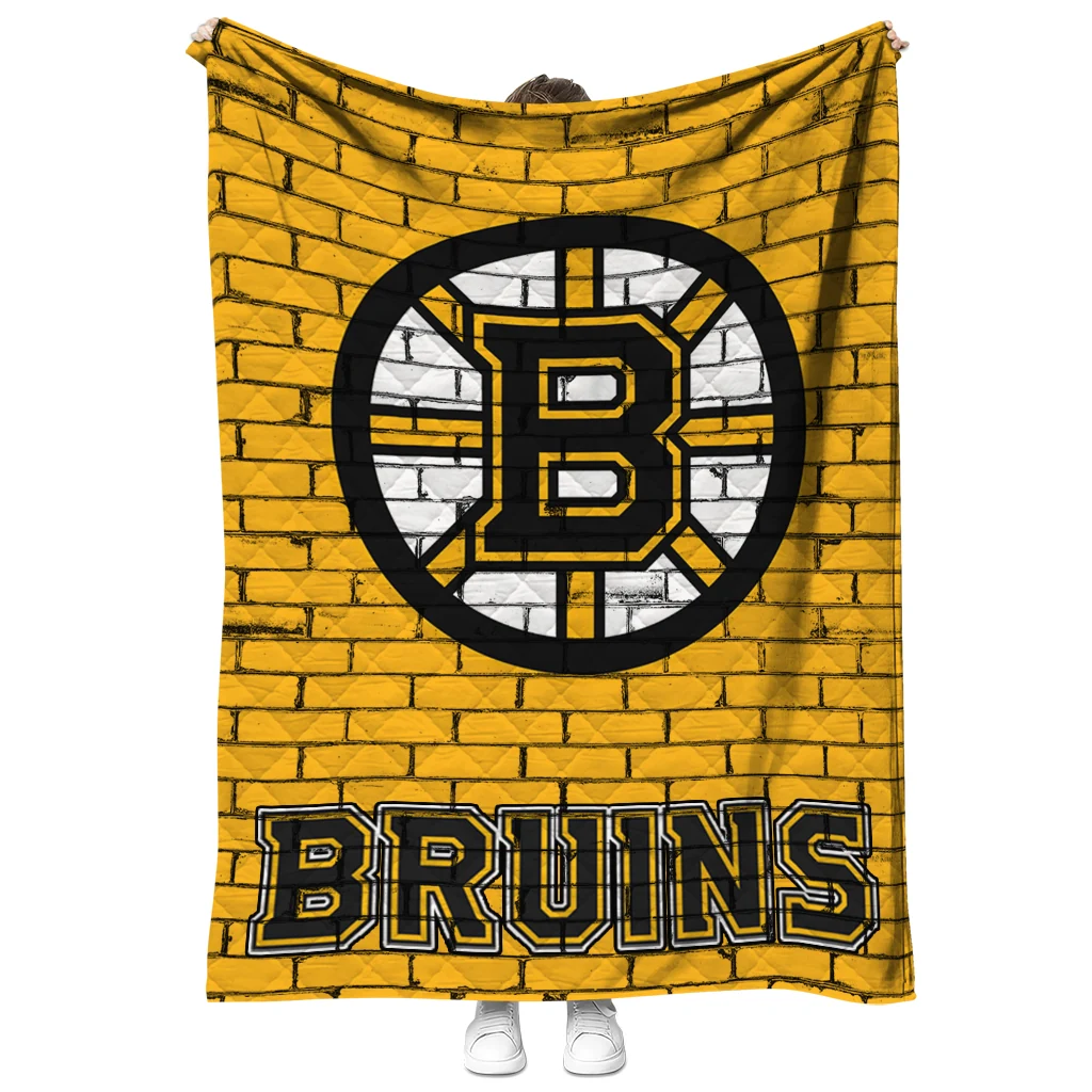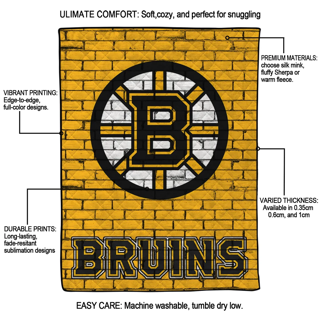 Wrap yourself in warmth and pride with the Boston Bruins Brick Grid Gold Quilt Blanket from the Boston Bruins Blankets collection at Yes That Blanket. Made from 100% premium quilting-weight polyester blended with a touch of microfiber, this quilt offers a smooth, soft finish you’ll love. Choose between two quilting styles—Stipple or Diagonal—and enjoy the comfort of a cotton-filled layer inside that adds extra coziness for every season. The border is available in classic black or white, giving your design a clean, timeless edge.