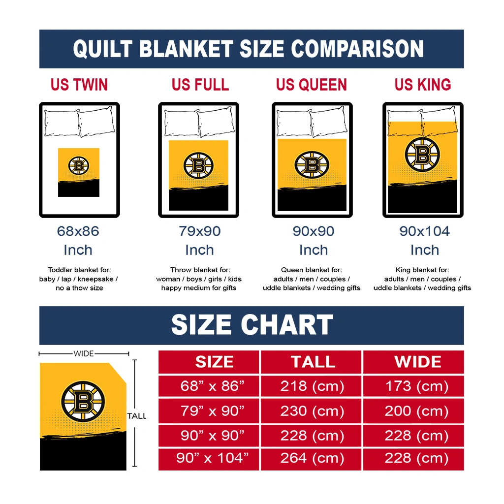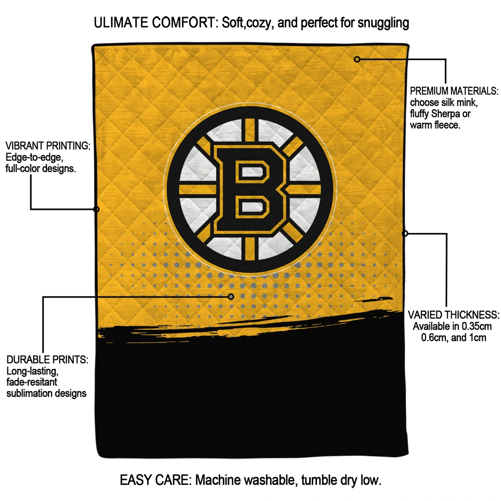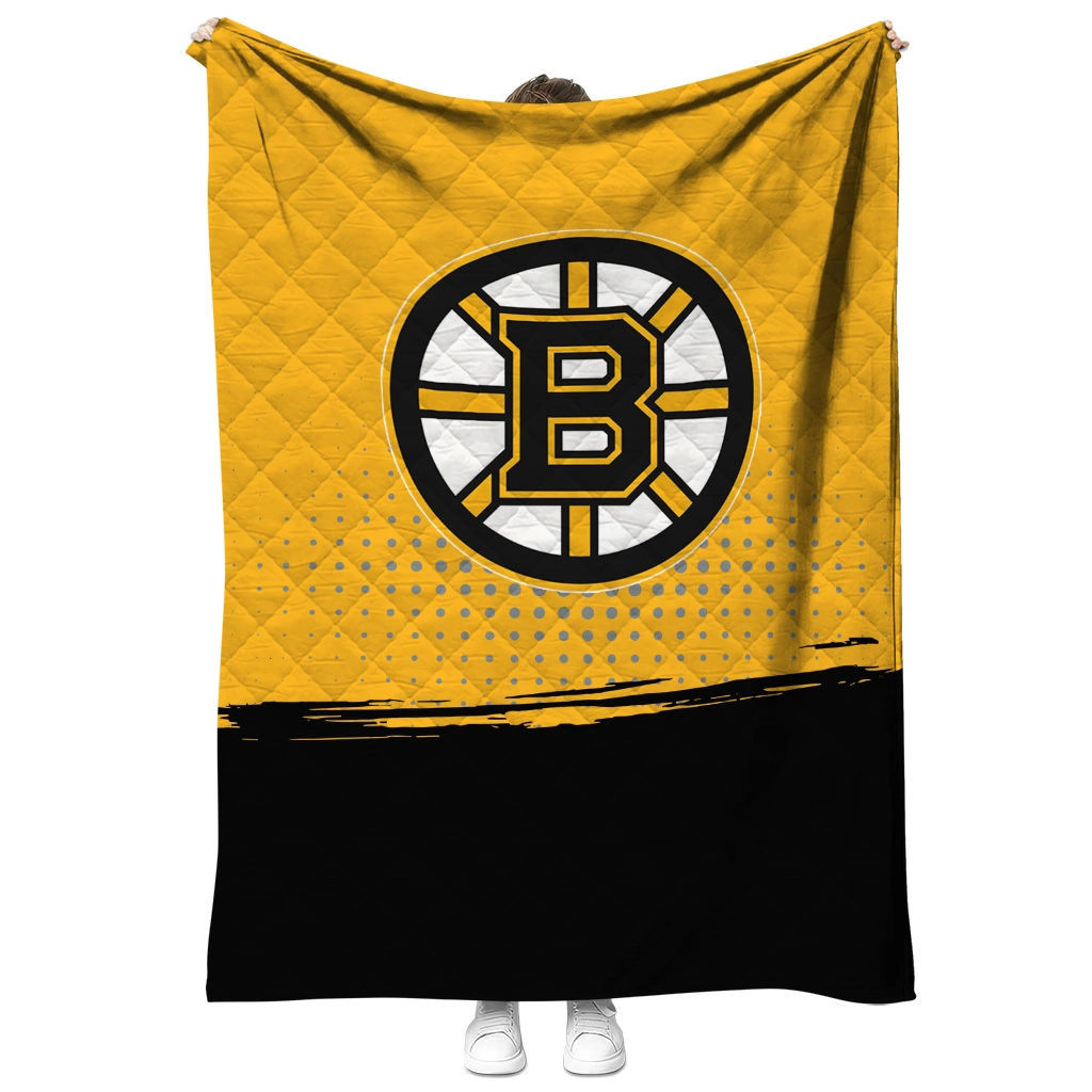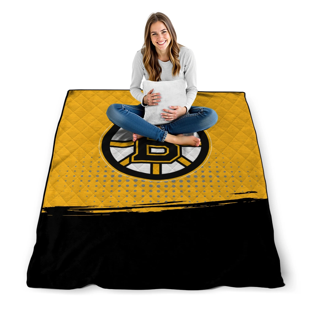 Wrap yourself in warmth and pride with the Boston Bruins Dot Illusion Gold Quilt Blanket from the Boston Bruins Blankets collection at Yes That Blanket. Made from 100% premium quilting-weight polyester blended with a touch of microfiber, this quilt offers a smooth, soft finish you’ll love. Choose between two quilting styles—Stipple or Diagonal—and enjoy the comfort of a cotton-filled layer inside that adds extra coziness for every season. The border is available in classic black or white, giving your design a clean, timeless edge.