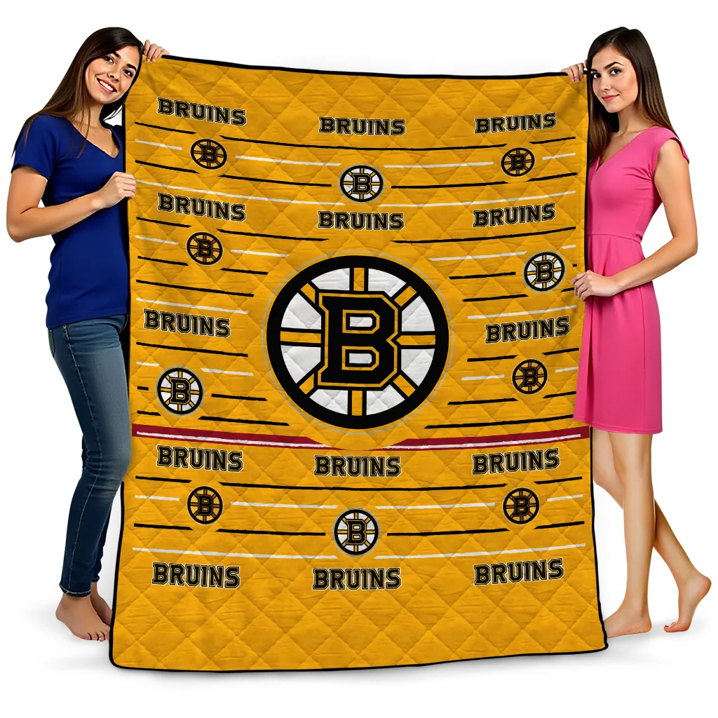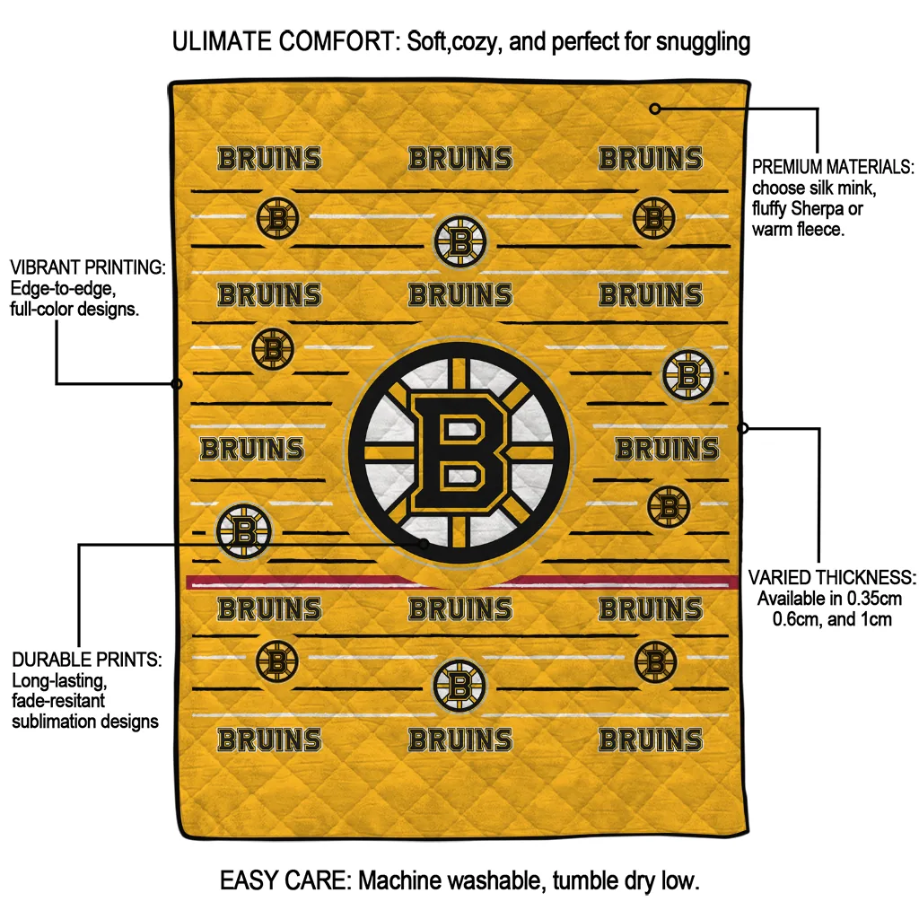 Wrap yourself in warmth and pride with the Boston Bruins Handdrawn Stripes Gold Quilt Blanket from the Boston Bruins Blankets collection at Yes That Blanket. Made from 100% premium quilting-weight polyester blended with a touch of microfiber, this quilt offers a smooth, soft finish you’ll love. Choose between two quilting styles—Stipple or Diagonal—and enjoy the comfort of a cotton-filled layer inside that adds extra coziness for every season. The border is available in classic black or white, giving your design a clean, timeless edge.