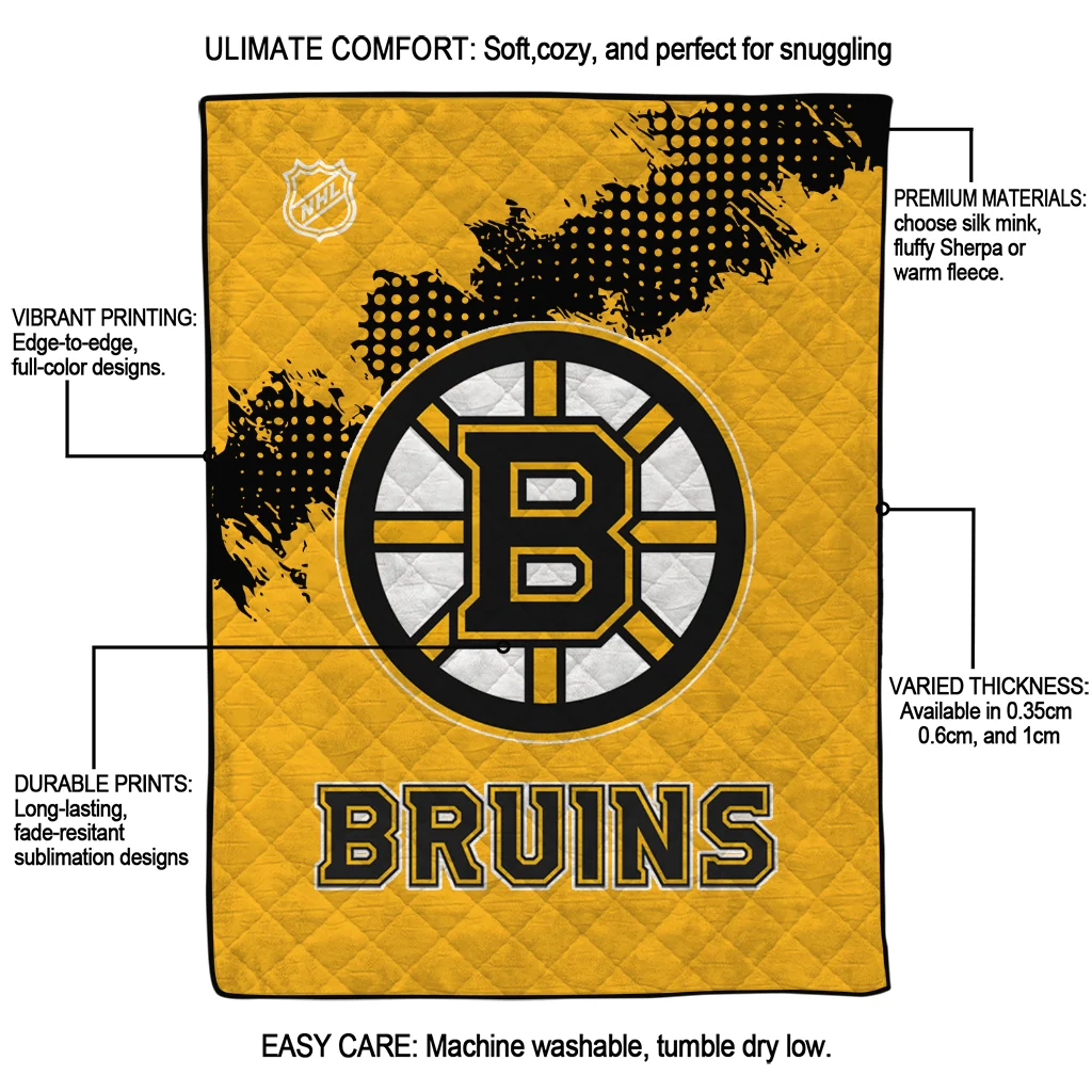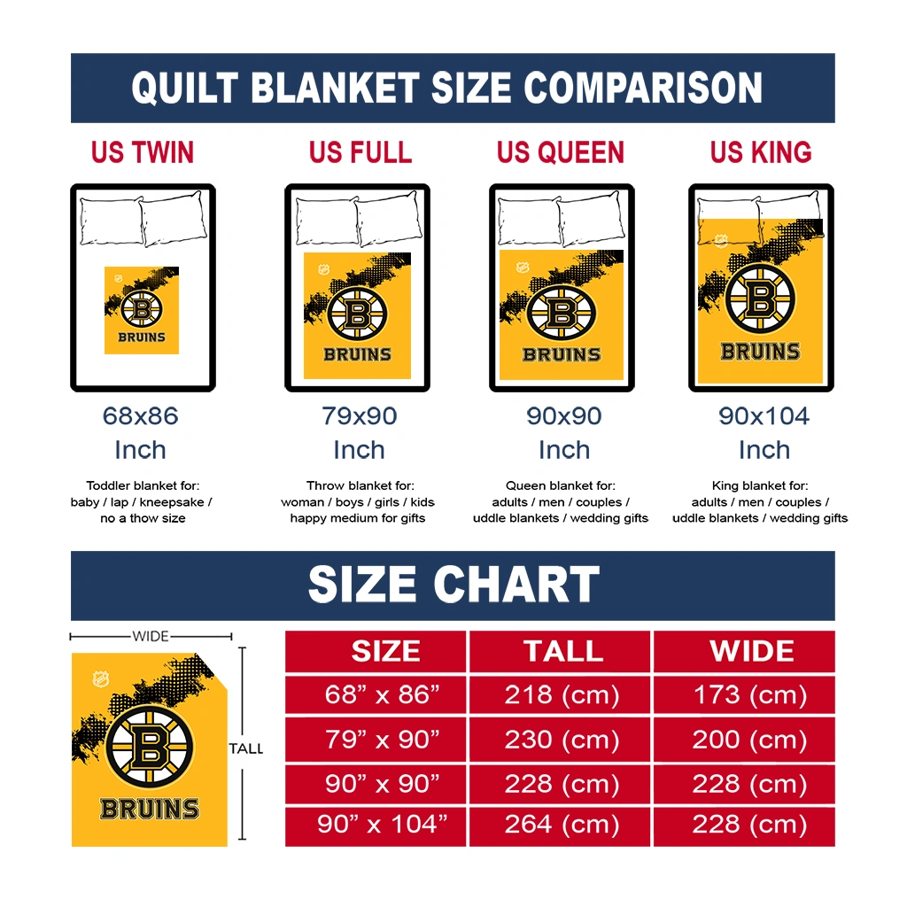Wrap yourself in warmth and pride with the Boston Bruins NHL Shield Gold Quilt Blanket from the Boston Bruins Blankets collection at Yes That Blanket. Made from 100% premium quilting-weight polyester blended with a touch of microfiber, this quilt offers a smooth, soft finish you’ll love. Choose between two quilting styles—Stipple or Diagonal—and enjoy the comfort of a cotton-filled layer inside that adds extra coziness for every season. The border is available in classic black or white, giving your design a clean, timeless edge.