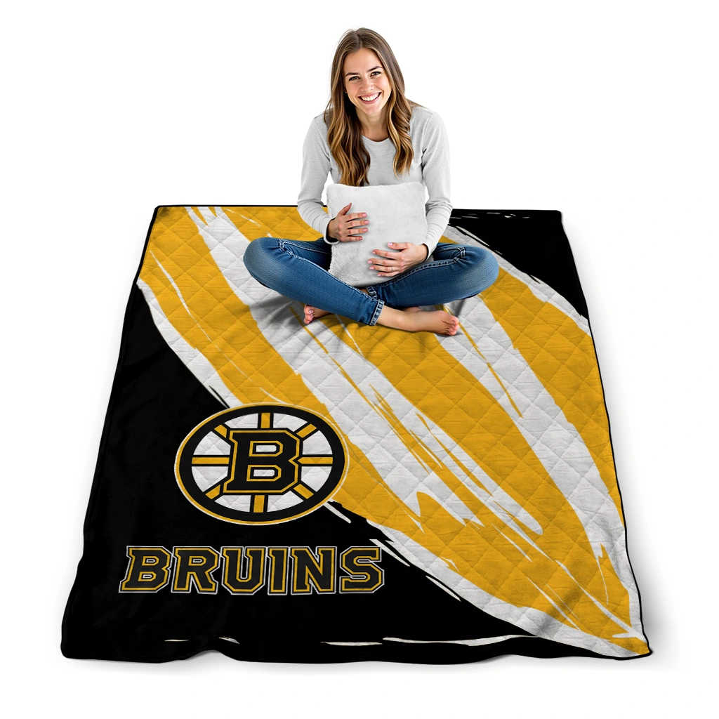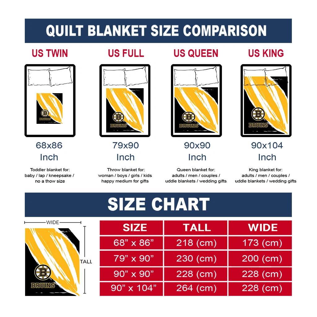 Wrap yourself in warmth and pride with the Boston Bruins Stroke Art Gold White Quilt Blanket from the Boston Bruins Blankets collection at Yes That Blanket. Made from 100% premium quilting-weight polyester blended with a touch of microfiber, this quilt offers a smooth, soft finish you’ll love. Choose between two quilting styles—Stipple or Diagonal—and enjoy the comfort of a cotton-filled layer inside that adds extra coziness for every season. The border is available in classic black or white, giving your design a clean, timeless edge.