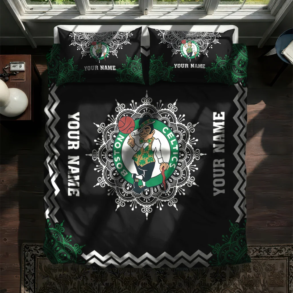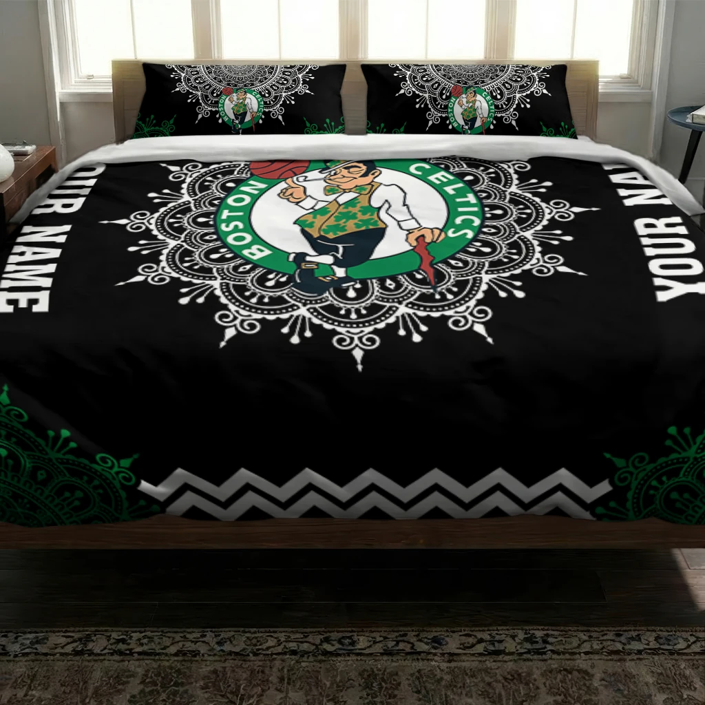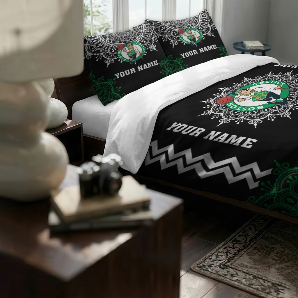 Boston Celtics Bedding Set – Personalized Mandala Lacework Black Green