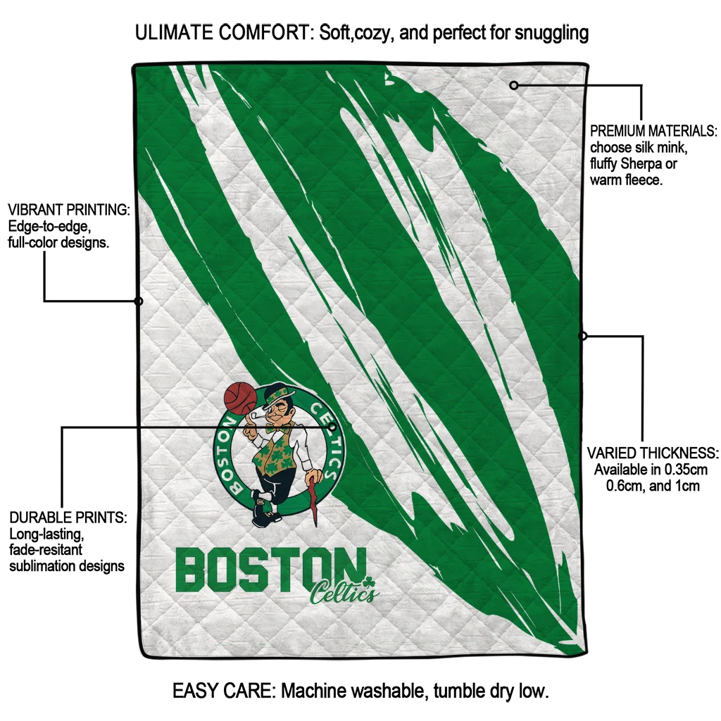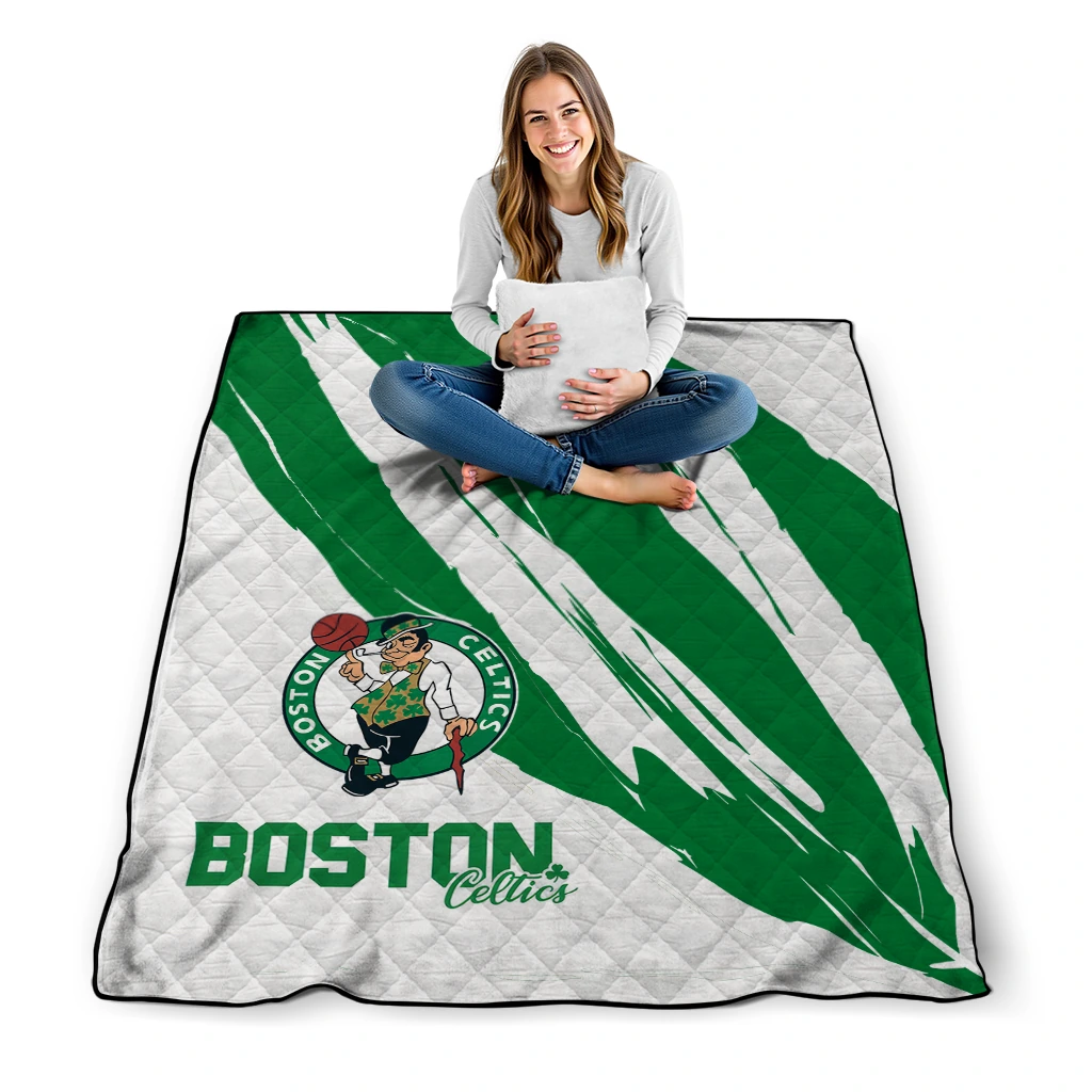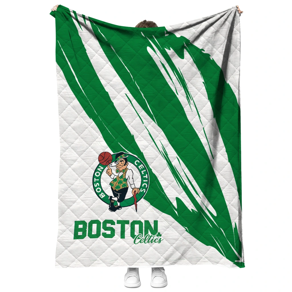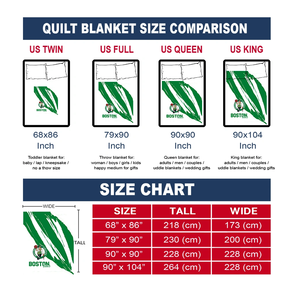 Wrap yourself in warmth and pride with the Boston Celtics Stroke Art Green White Quilt Blanket from the Boston Celtics Blankets collection at Yes That Blanket. Made from 100% premium quilting-weight polyester blended with a touch of microfiber, this quilt offers a smooth, soft finish you’ll love. Choose between two quilting styles—Stipple or Diagonal—and enjoy the comfort of a cotton-filled layer inside that adds extra coziness for every season. The border is available in classic black or white, giving your design a clean, timeless edge.