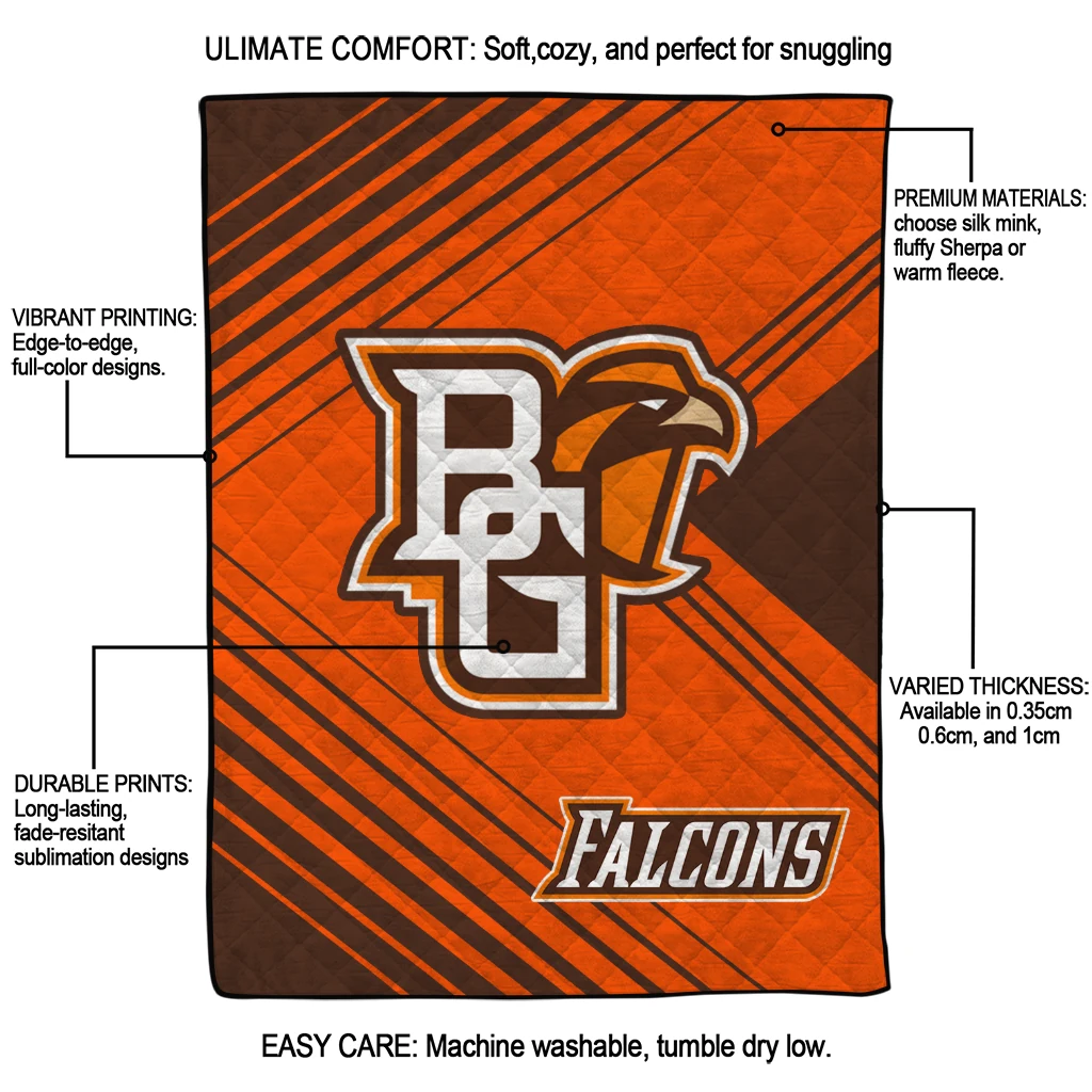 Wrap yourself in warmth and pride with the Bowling Green Falcons Arrow Layers Orange Quilt Blanket from the Bowling Green Falcons Blankets collection at Yes That Blanket. Made from 100% premium quilting-weight polyester blended with a touch of microfiber, this quilt offers a smooth, soft finish you’ll love. Choose between two quilting styles—Stipple or Diagonal—and enjoy the comfort of a cotton-filled layer inside that adds extra coziness for every season. The border is available in classic black or white, giving your design a clean, timeless edge.