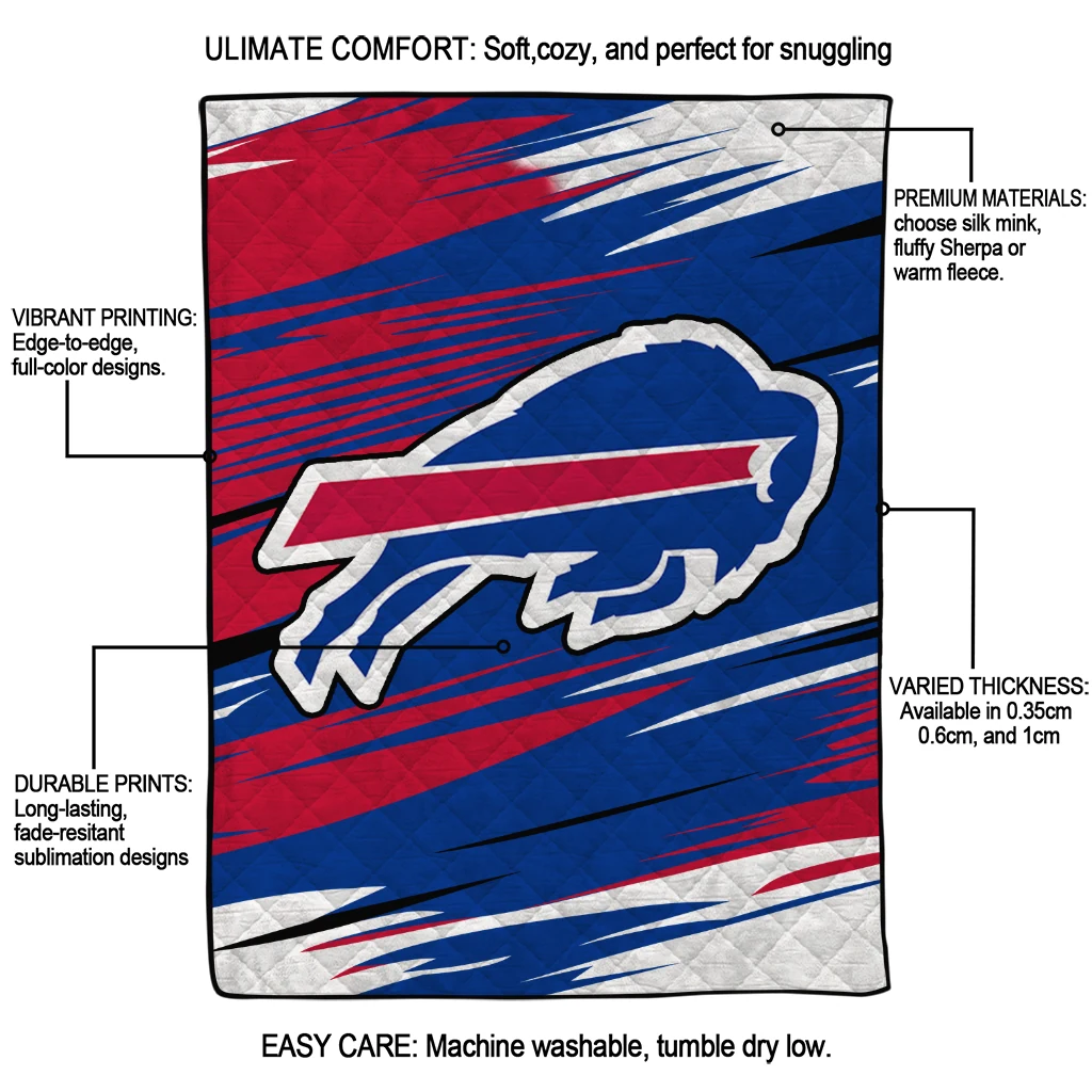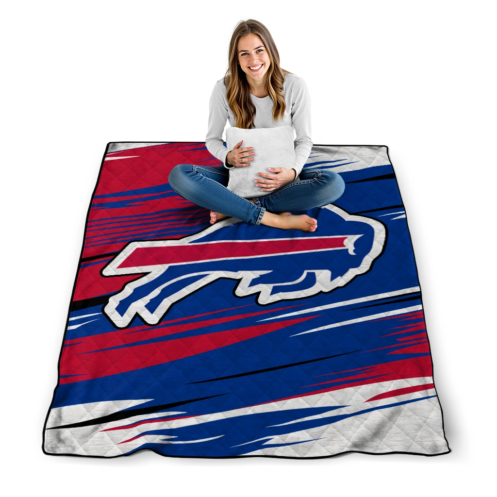 The Buffalo Bills Wild Lines Blue White Quilt Blanket is more than a blanket—it’s everyday comfort, thoughtfully made. Crafted from premium quilting fabric with a soft microfiber touch, it offers a smooth hand-feel and lasting coziness. Layered quilting with a cotton-filled core provides adaptable warmth across seasons while maintaining a clean, tailored look on your bed or sofa.