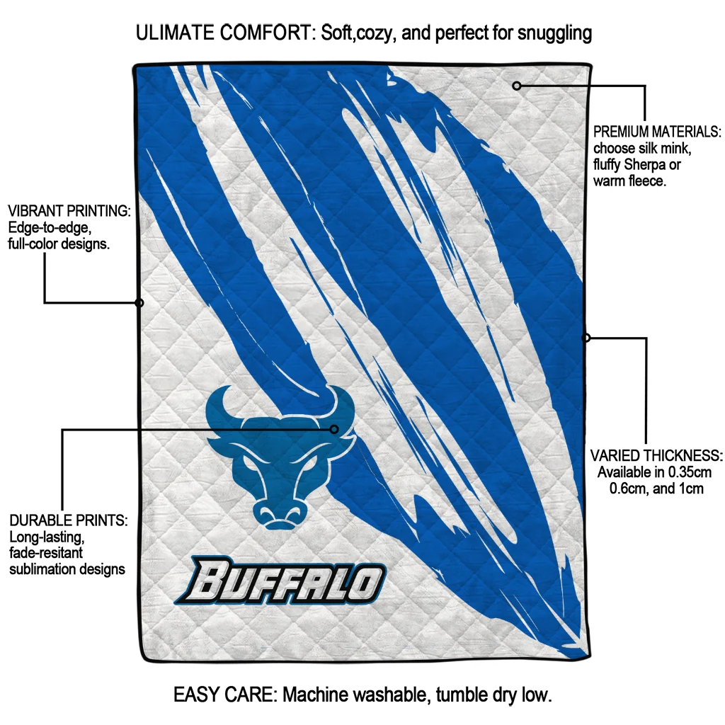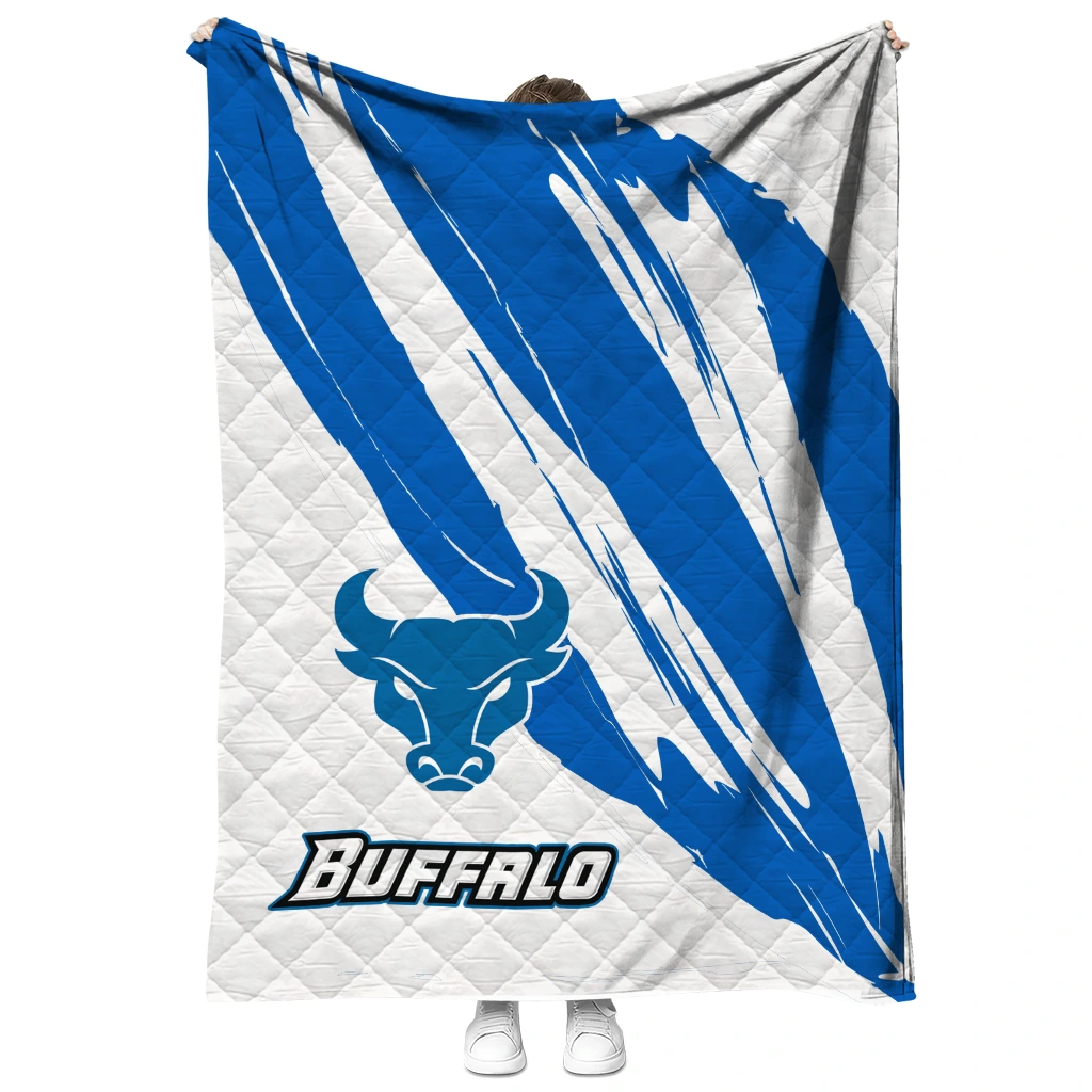 Wrap yourself in warmth and pride with the Buffalo Bulls Stroke Art Royal Blue White Quilt Blanket from the Buffalo Bulls Blankets collection at Yes That Blanket. Made from 100% premium quilting-weight polyester blended with a touch of microfiber, this quilt offers a smooth, soft finish you’ll love. Choose between two quilting styles—Stipple or Diagonal—and enjoy the comfort of a cotton-filled layer inside that adds extra coziness for every season. The border is available in classic black or white, giving your design a clean, timeless edge.