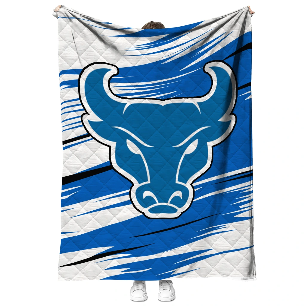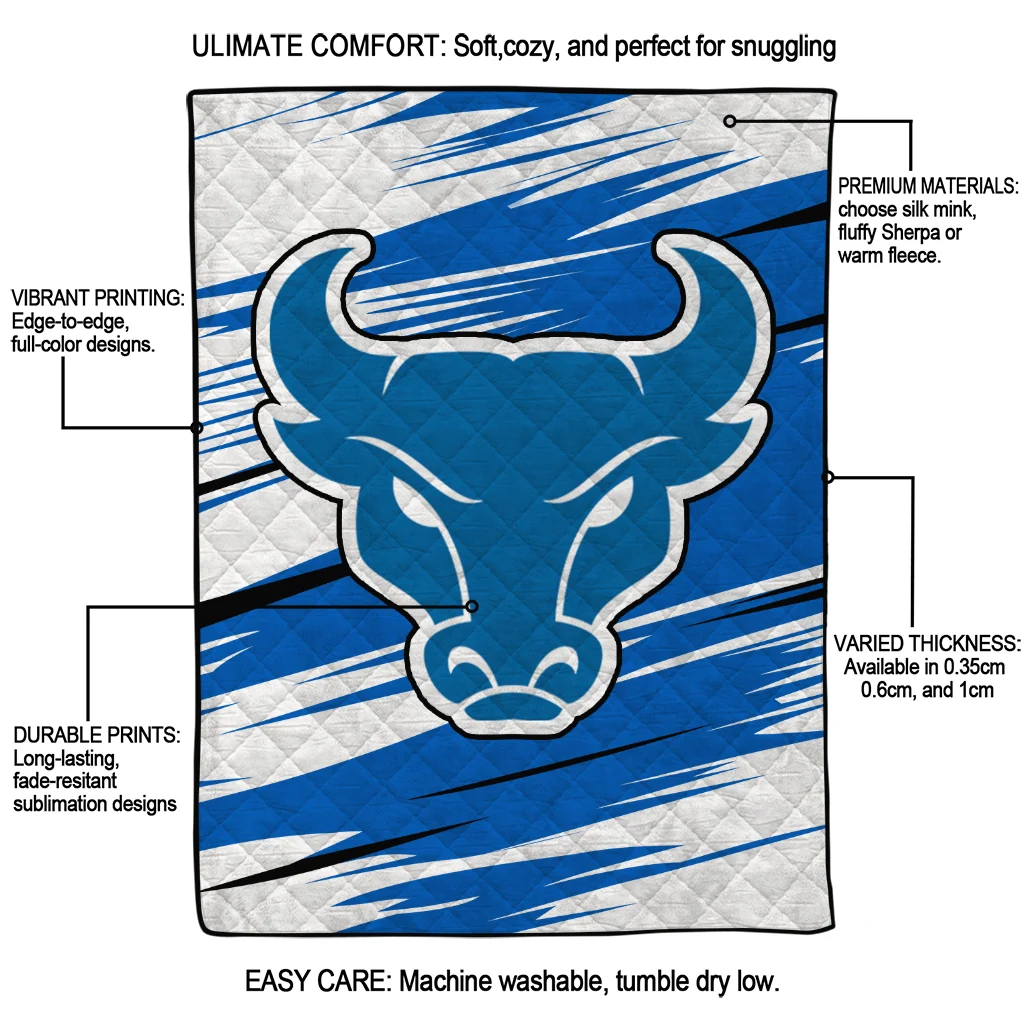 Wrap yourself in warmth and pride with the Buffalo Bulls Wild Lines Royal Blue White Quilt Blanket from the Buffalo Bulls Blankets collection at Yes That Blanket. Made from 100% premium quilting-weight polyester blended with a touch of microfiber, this quilt offers a smooth, soft finish you’ll love. Choose between two quilting styles—Stipple or Diagonal—and enjoy the comfort of a cotton-filled layer inside that adds extra coziness for every season. The border is available in classic black or white, giving your design a clean, timeless edge.