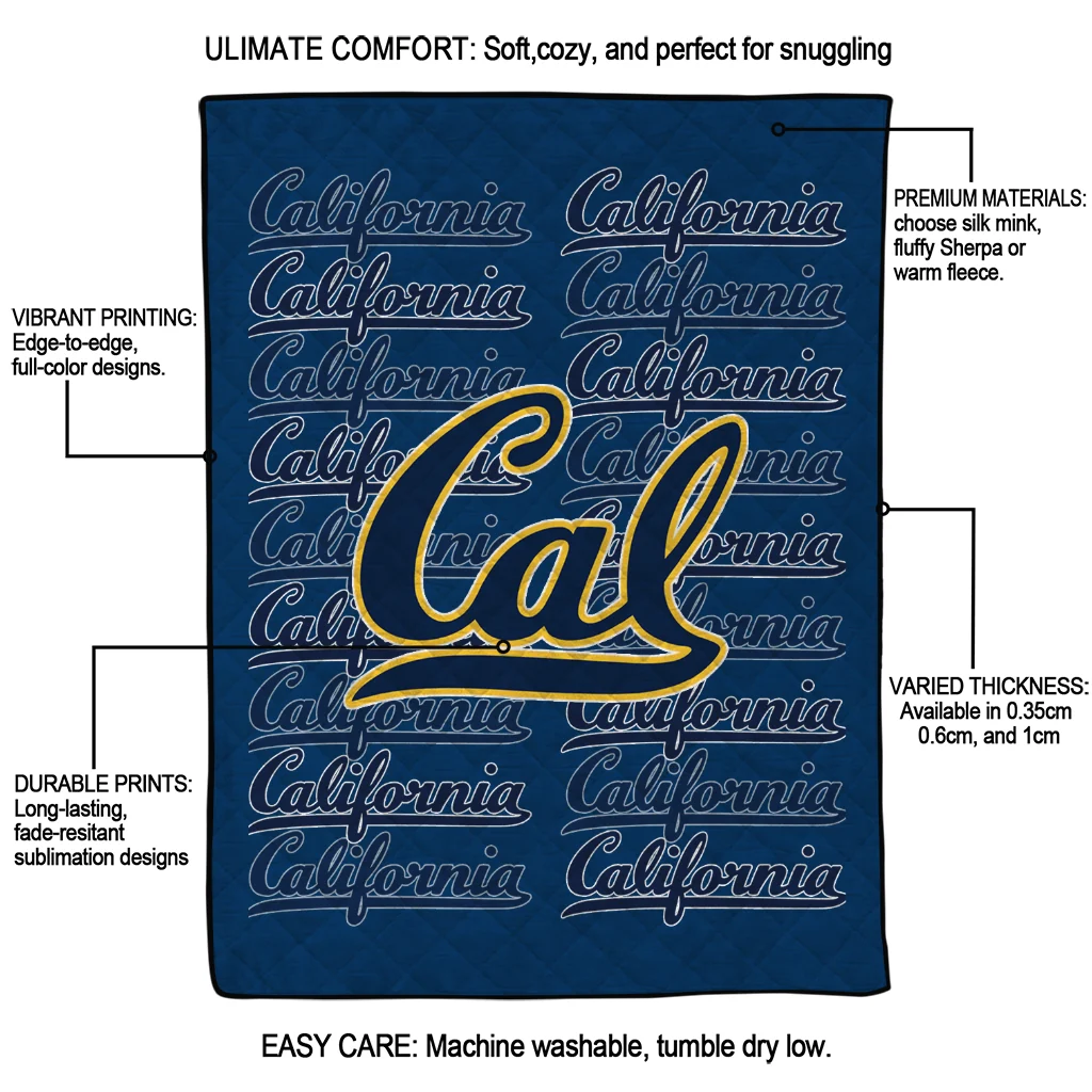 Wrap yourself in warmth and pride with the California Golden Bears Bold Red Blue Quilt Blanket from the California Golden Bears Blankets collection at Yes That Blanket. Made from 100% premium quilting-weight polyester blended with a touch of microfiber, this quilt offers a smooth, soft finish you’ll love. Choose between two quilting styles—Stipple or Diagonal—and enjoy the comfort of a cotton-filled layer inside that adds extra coziness for every season. The border is available in classic black or white, giving your design a clean, timeless edge.