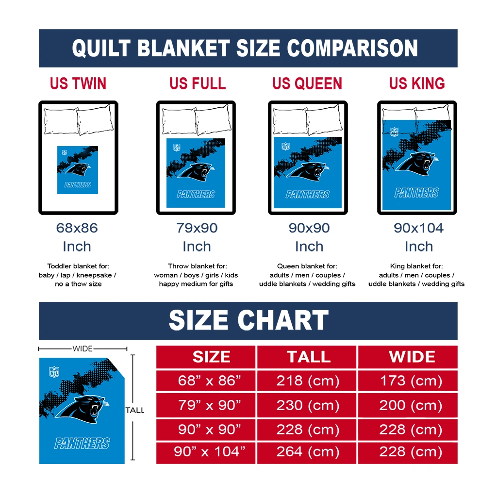 The Carolina Panthers Shield Badge Blue Quilt Blanket is more than a blanket—it’s everyday comfort, thoughtfully made. Crafted from premium quilting fabric with a soft microfiber touch, it offers a smooth hand-feel and lasting coziness. Layered quilting with a cotton-filled core provides adaptable warmth across seasons while maintaining a clean, tailored look on your bed or sofa.