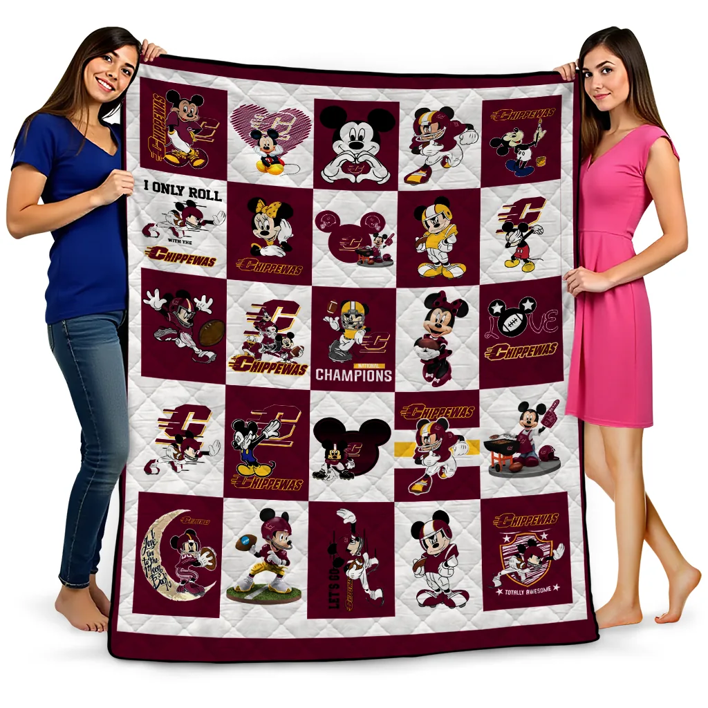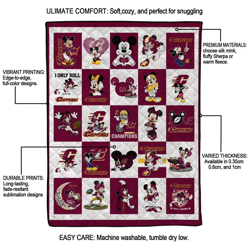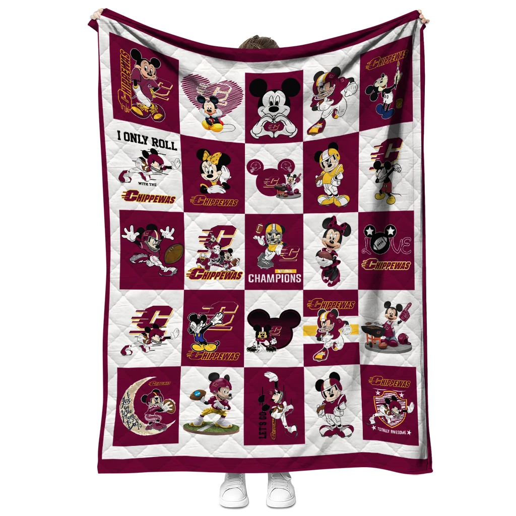 Central Michigan Chippewas Mickey Mouse Motif Maroon White Quilt Blanket