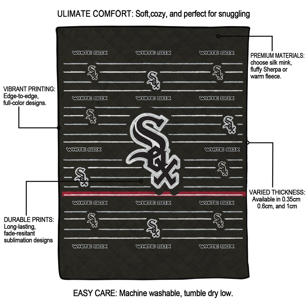 Wrap yourself in warmth and pride with the Chicago White Sox Handdrawn Stripes Black Quilt Blanket from the Chicago White Sox Blankets collection at Yes That Blanket. Made from 100% premium quilting-weight polyester blended with a touch of microfiber, this quilt offers a smooth, soft finish you’ll love. Choose between two quilting styles—Stipple or Diagonal—and enjoy the comfort of a cotton-filled layer inside that adds extra coziness for every season. The border is available in classic black or white, giving your design a clean, timeless edge.