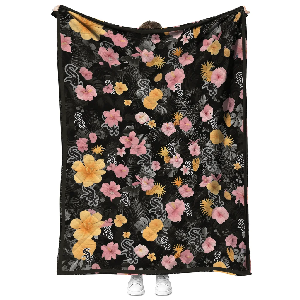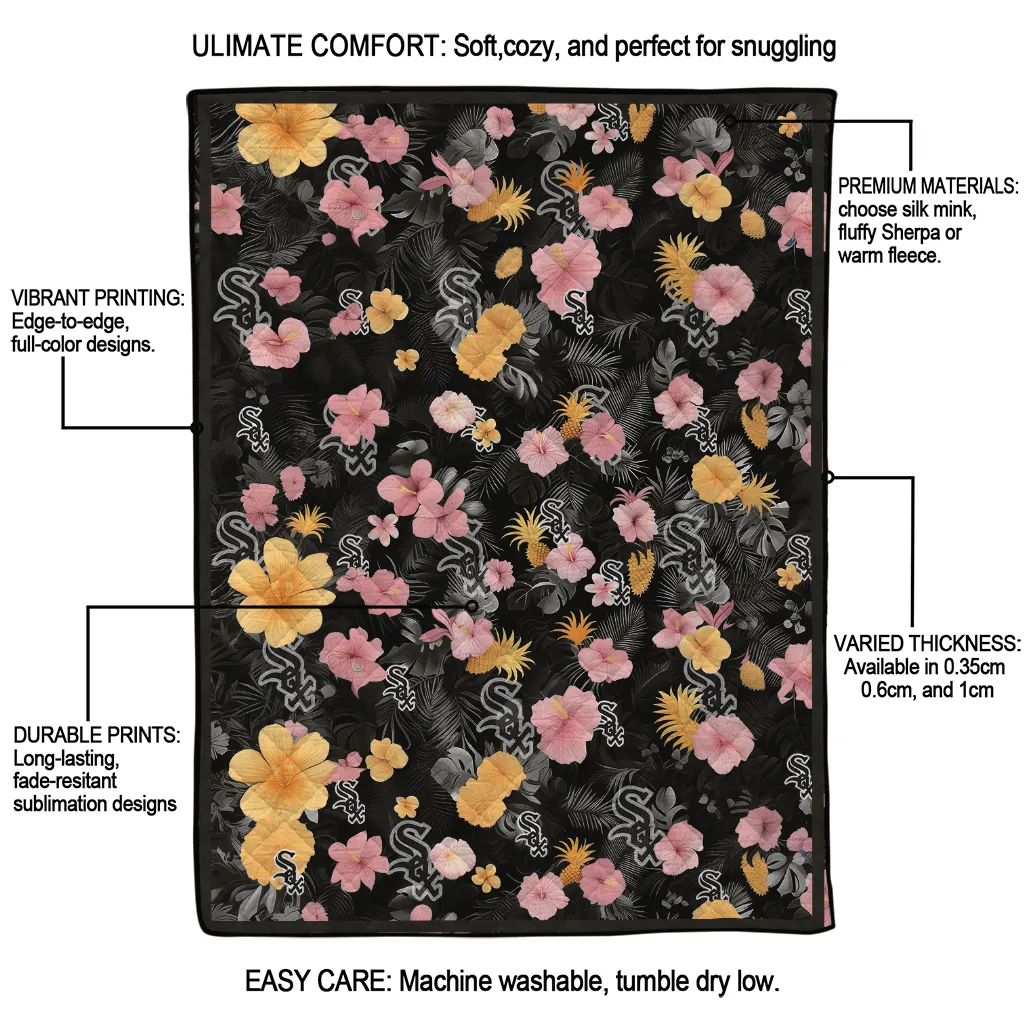 Wrap yourself in warmth and pride with the Chicago White Sox Hibiscus Foliage Black Quilt Blanket from the Chicago White Sox Blankets collection at Yes That Blanket. Made from 100% premium quilting-weight polyester blended with a touch of microfiber, this quilt offers a smooth, soft finish you’ll love. Choose between two quilting styles—Stipple or Diagonal—and enjoy the comfort of a cotton-filled layer inside that adds extra coziness for every season. The border is available in classic black or white, giving your design a clean, timeless edge.