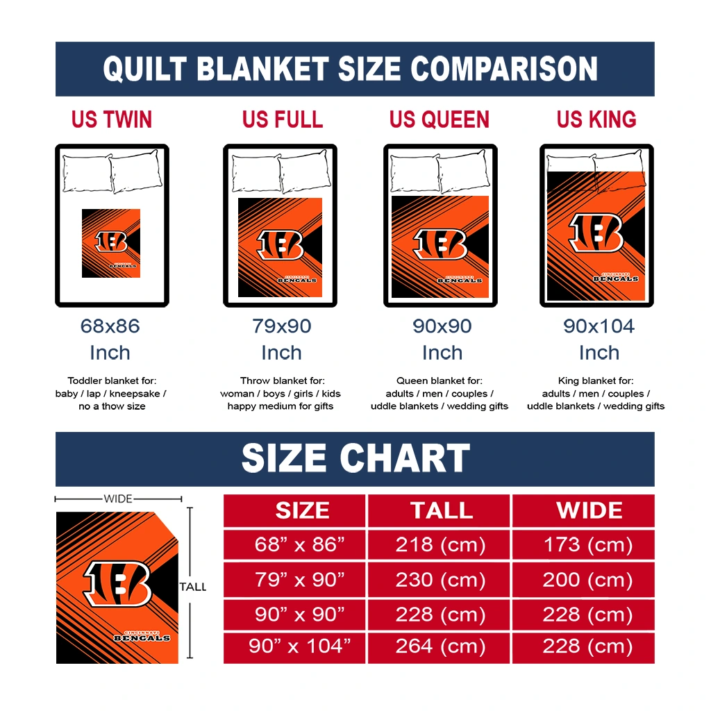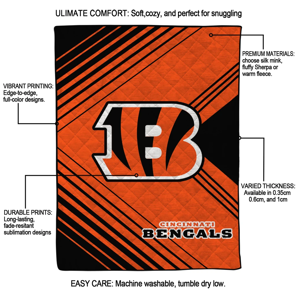 Wrap yourself in warmth and pride with the Cincinnati Bengals Arrow Layers Orange Quilt Blanket from the Cincinnati Bengals Blankets collection at Yes That Blanket. Made from 100% premium quilting-weight polyester blended with a touch of microfiber, this quilt offers a smooth, soft finish you’ll love. Choose between two quilting styles—Stipple or Diagonal—and enjoy the comfort of a cotton-filled layer inside that adds extra coziness for every season. The border is available in classic black or white, giving your design a clean, timeless edge.