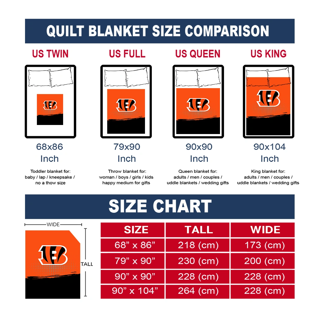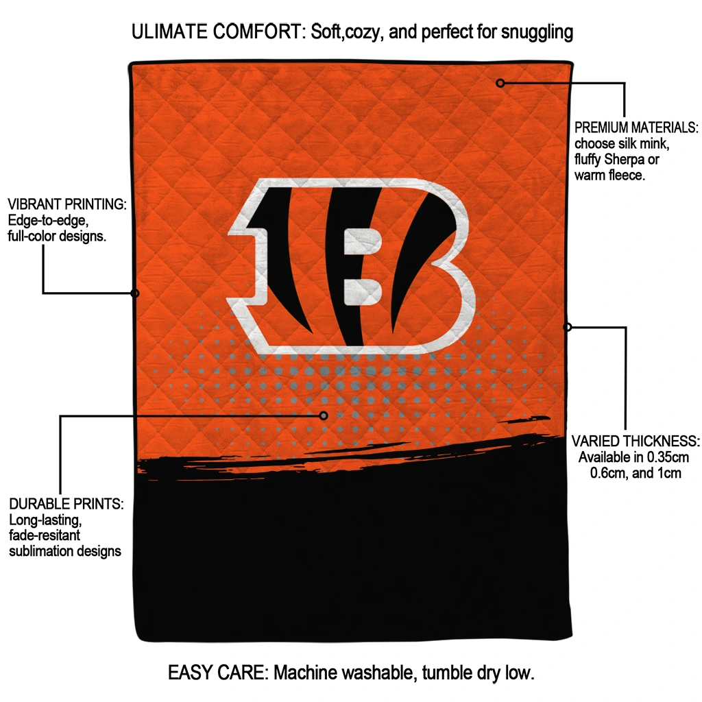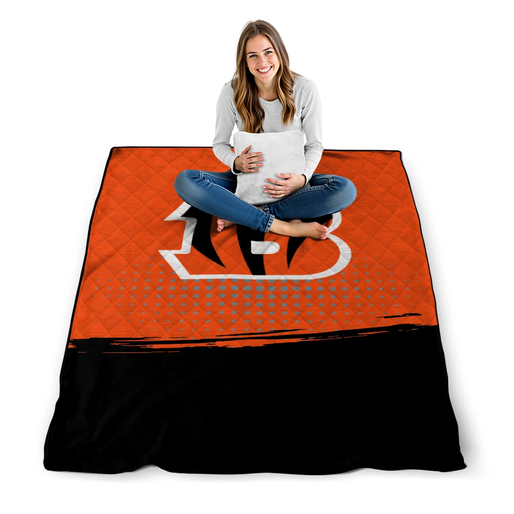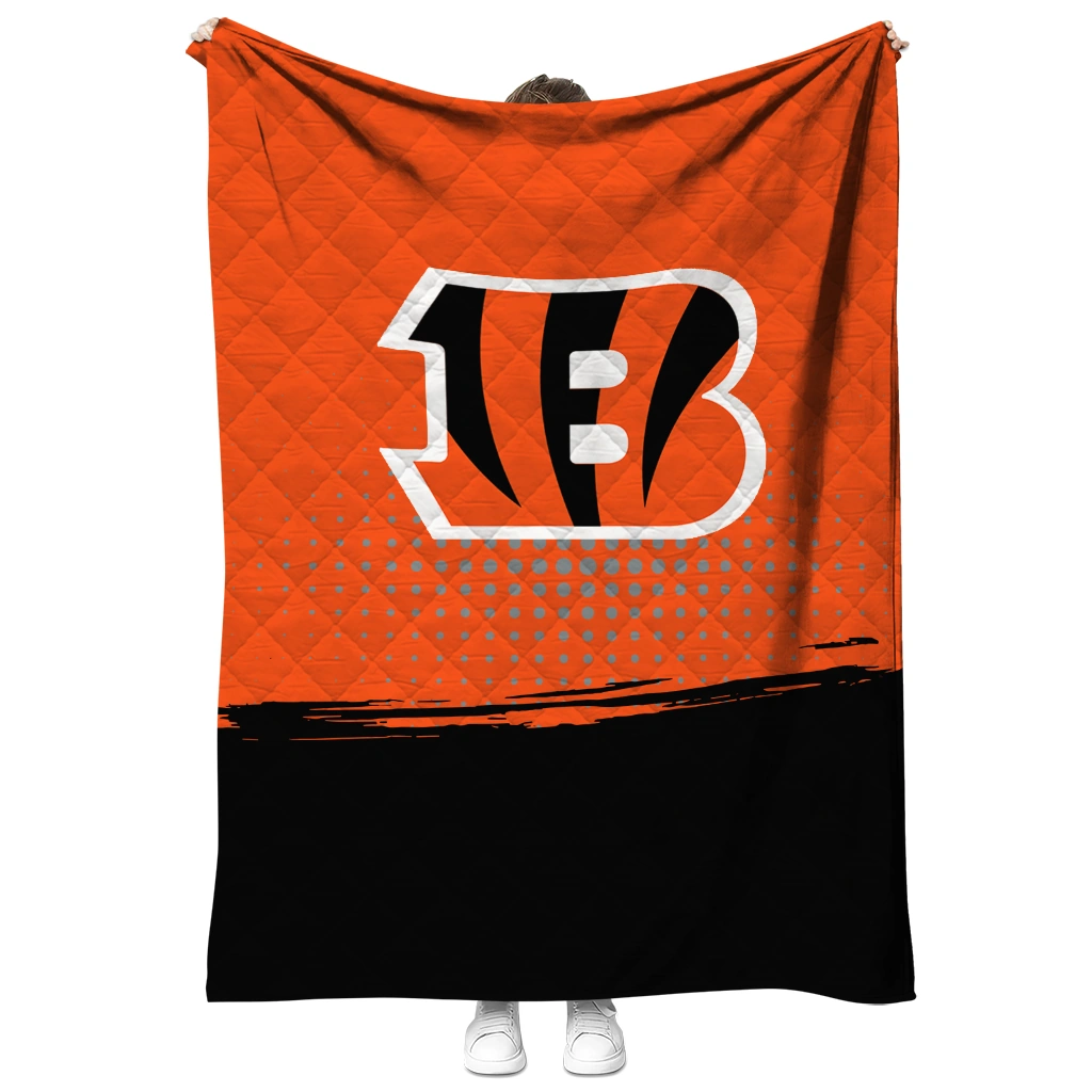 Wrap yourself in warmth and pride with the Cincinnati Bengals Dot Illusion Orange Quilt Blanket from the Cincinnati Bengals Blankets collection at Yes That Blanket. Made from 100% premium quilting-weight polyester blended with a touch of microfiber, this quilt offers a smooth, soft finish you’ll love. Choose between two quilting styles—Stipple or Diagonal—and enjoy the comfort of a cotton-filled layer inside that adds extra coziness for every season. The border is available in classic black or white, giving your design a clean, timeless edge.