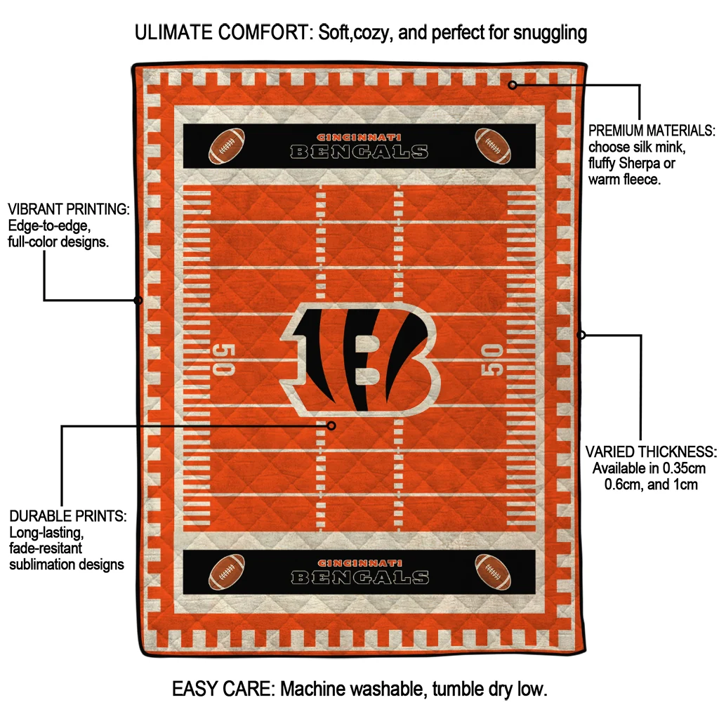 Wrap yourself in warmth and pride with the Cincinnati Bengals Mickey Player Orange Quilt Blanket from the Cincinnati Bengals Blankets collection at Yes That Blanket. Made from 100% premium quilting-weight polyester blended with a touch of microfiber, this quilt offers a smooth, soft finish you’ll love. Choose between two quilting styles—Stipple or Diagonal—and enjoy the comfort of a cotton-filled layer inside that adds extra coziness for every season. The border is available in classic black or white, giving your design a clean, timeless edge.