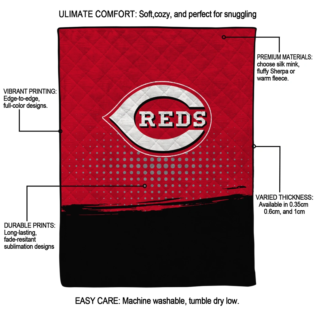 Wrap yourself in warmth and pride with the Cincinnati Reds Dot Illusion Red Quilt Blanket from the Cincinnati Reds Blankets collection at Yes That Blanket. Made from 100% premium quilting-weight polyester blended with a touch of microfiber, this quilt offers a smooth, soft finish you’ll love. Choose between two quilting styles—Stipple or Diagonal—and enjoy the comfort of a cotton-filled layer inside that adds extra coziness for every season. The border is available in classic black or white, giving your design a clean, timeless edge.