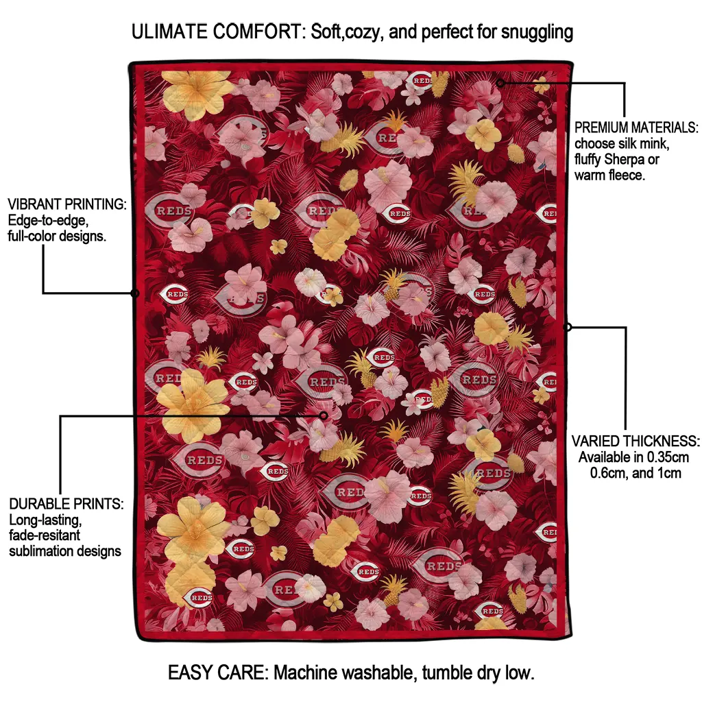 Wrap yourself in warmth and pride with the Cincinnati Reds Hibiscus Foliage Red Quilt Blanket from the Cincinnati Reds Blankets collection at Yes That Blanket. Made from 100% premium quilting-weight polyester blended with a touch of microfiber, this quilt offers a smooth, soft finish you’ll love. Choose between two quilting styles—Stipple or Diagonal—and enjoy the comfort of a cotton-filled layer inside that adds extra coziness for every season. The border is available in classic black or white, giving your design a clean, timeless edge.