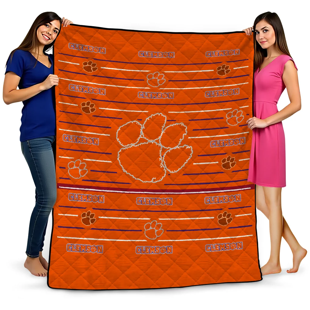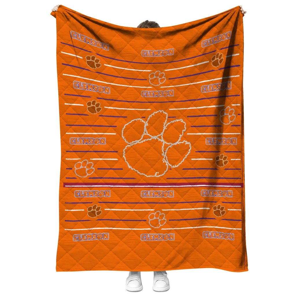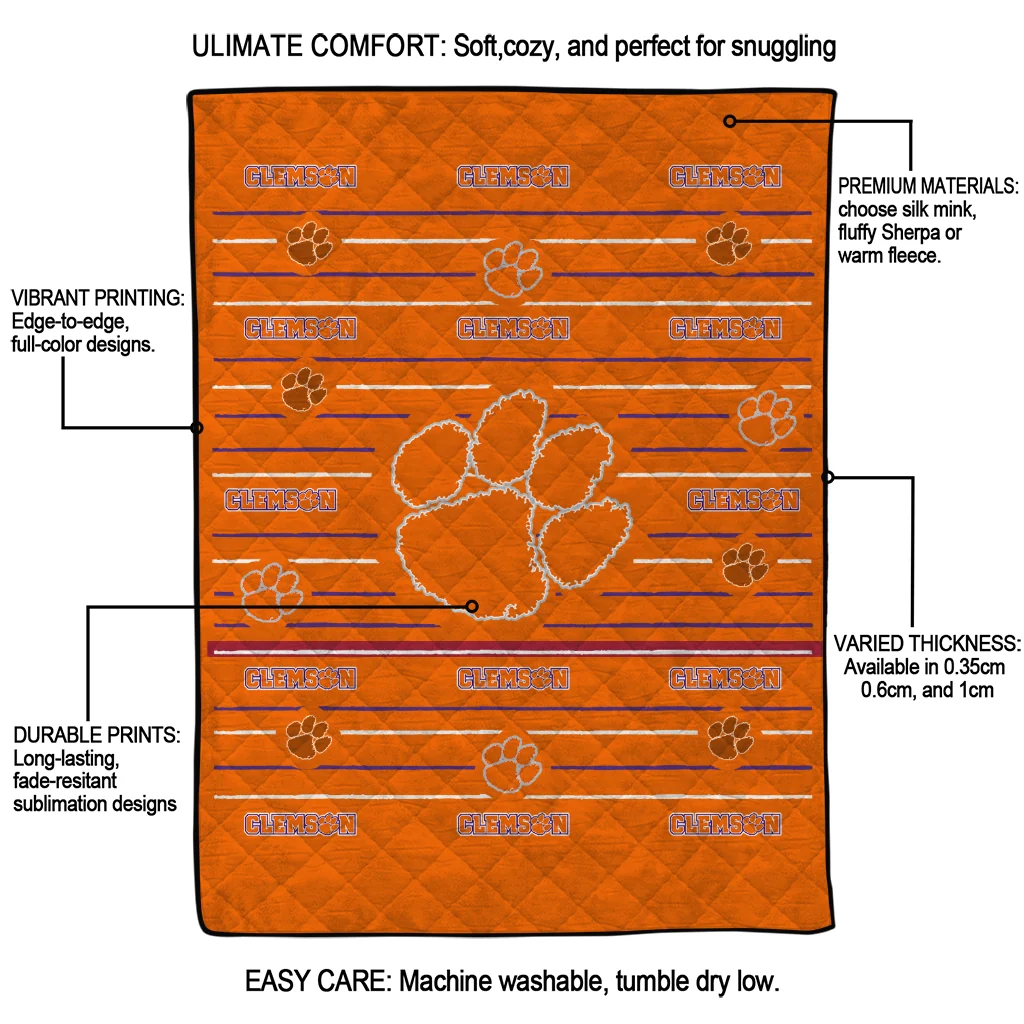 Wrap yourself in warmth and pride with the Clemson Tigers Handdrawn Stripes Orange Quilt Blanket from the Clemson Tigers Blankets collection at Yes That Blanket. Made from 100% premium quilting-weight polyester blended with a touch of microfiber, this quilt offers a smooth, soft finish you’ll love. Choose between two quilting styles—Stipple or Diagonal—and enjoy the comfort of a cotton-filled layer inside that adds extra coziness for every season. The border is available in classic black or white, giving your design a clean, timeless edge.