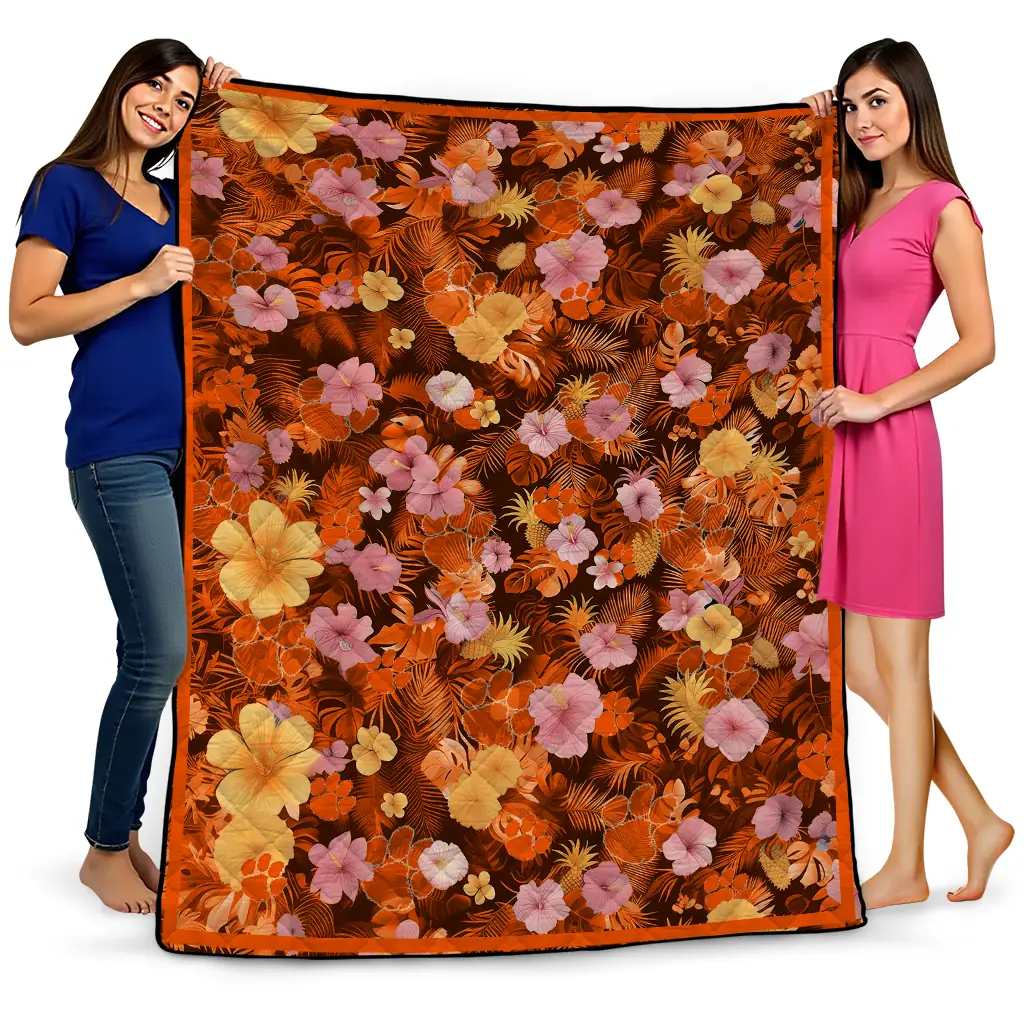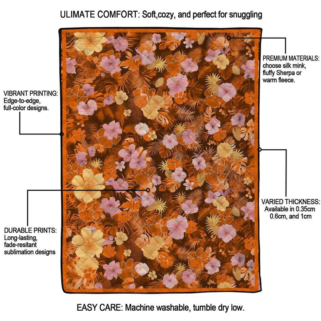 Wrap yourself in warmth and pride with the Clemson Tigers Hibiscus Foliage Orange Quilt Blanket from the Clemson Tigers Blankets collection at Yes That Blanket. Made from 100% premium quilting-weight polyester blended with a touch of microfiber, this quilt offers a smooth, soft finish you’ll love. Choose between two quilting styles—Stipple or Diagonal—and enjoy the comfort of a cotton-filled layer inside that adds extra coziness for every season. The border is available in classic black or white, giving your design a clean, timeless edge.
