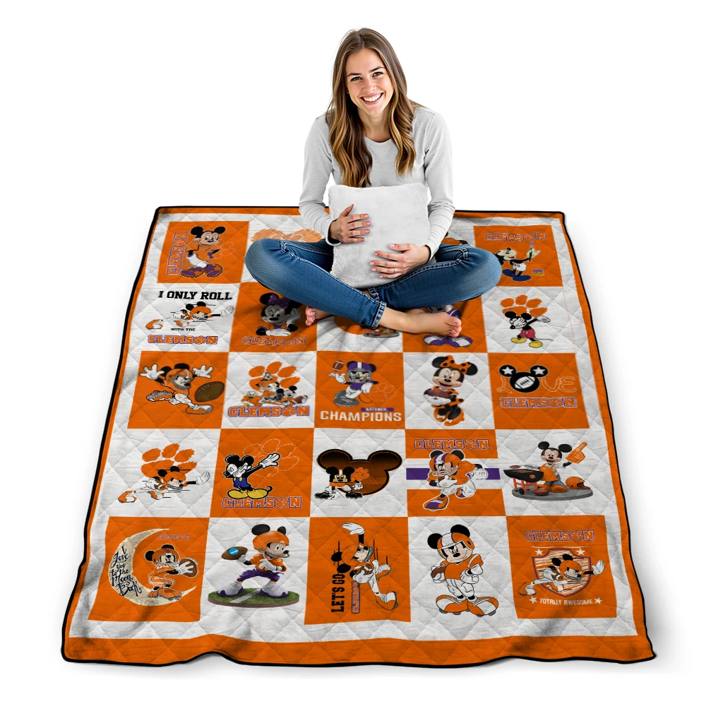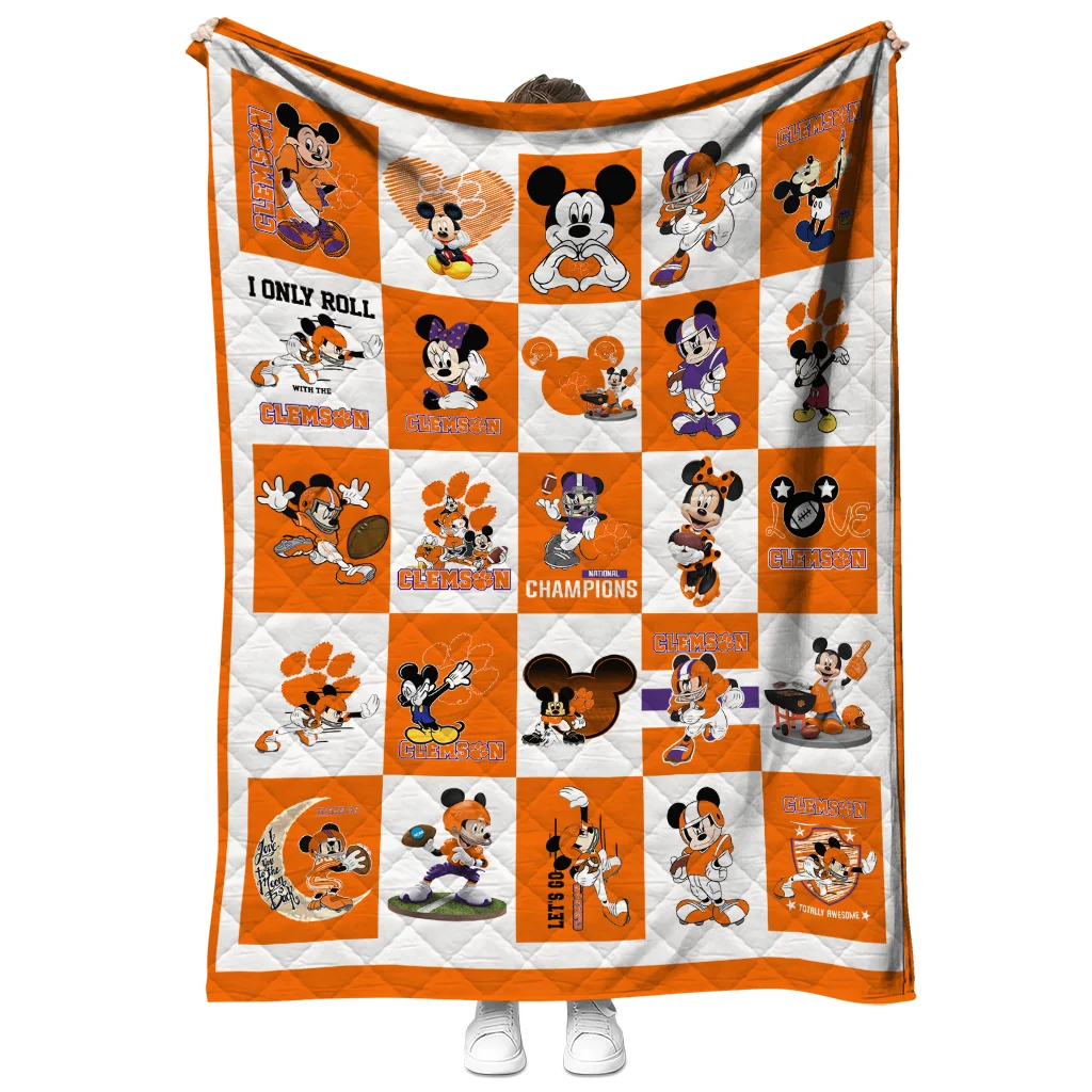 Wrap yourself in warmth and pride with the Clemson Tigers Mickey Mouse Motif Orange White Quilt Blanket from the Clemson Tigers Blankets collection at Yes That Blanket. Made from 100% premium quilting-weight polyester blended with a touch of microfiber, this quilt offers a smooth, soft finish you’ll love. Choose between two quilting styles—Stipple or Diagonal—and enjoy the comfort of a cotton-filled layer inside that adds extra coziness for every season. The border is available in classic black or white, giving your design a clean, timeless edge.