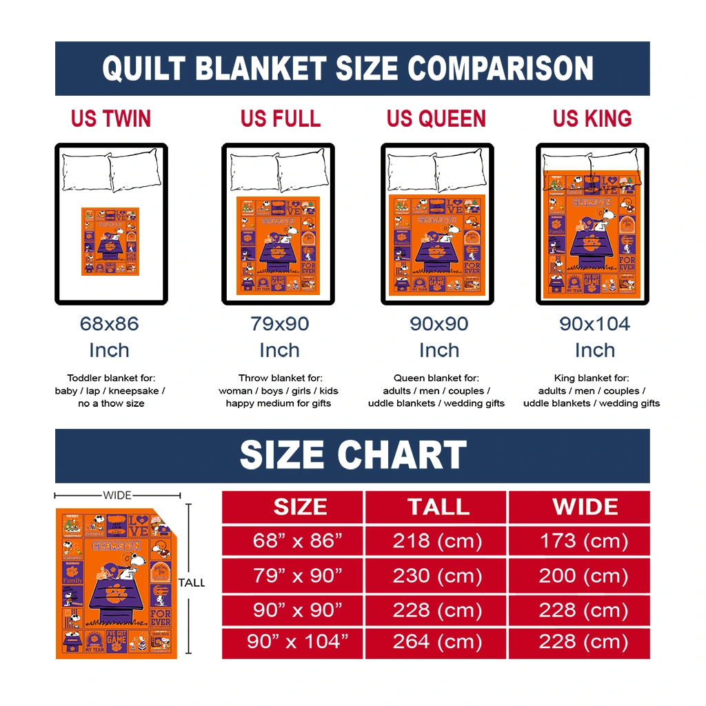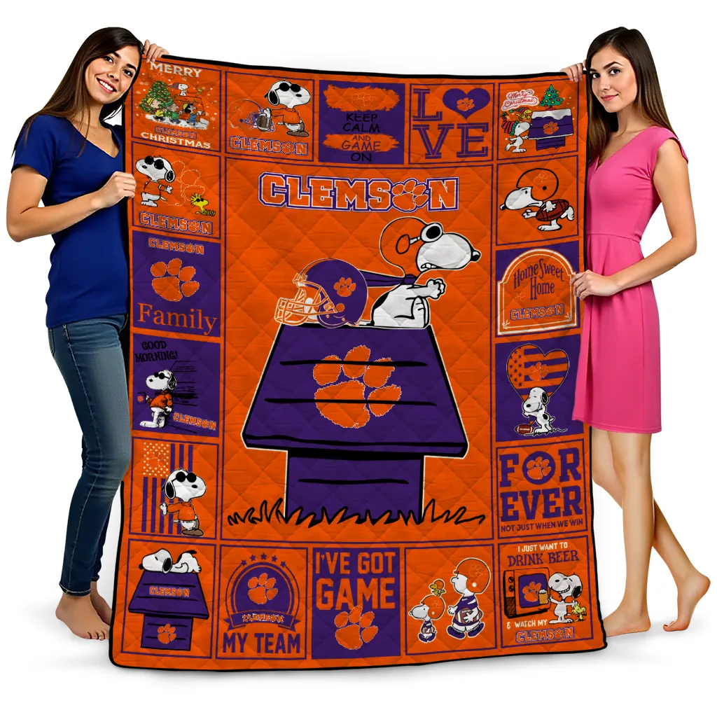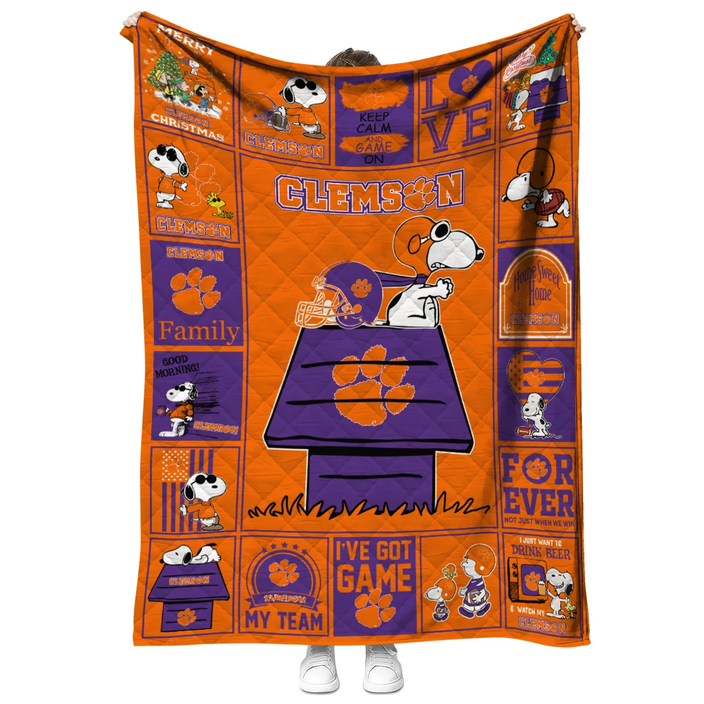 Wrap yourself in warmth and pride with the Clemson Tigers Snoopy Love Orange Quilt Blanket from the Clemson Tigers Blankets collection at Yes That Blanket. Made from 100% premium quilting-weight polyester blended with a touch of microfiber, this quilt offers a smooth, soft finish you’ll love. Choose between two quilting styles—Stipple or Diagonal—and enjoy the comfort of a cotton-filled layer inside that adds extra coziness for every season. The border is available in classic black or white, giving your design a clean, timeless edge.