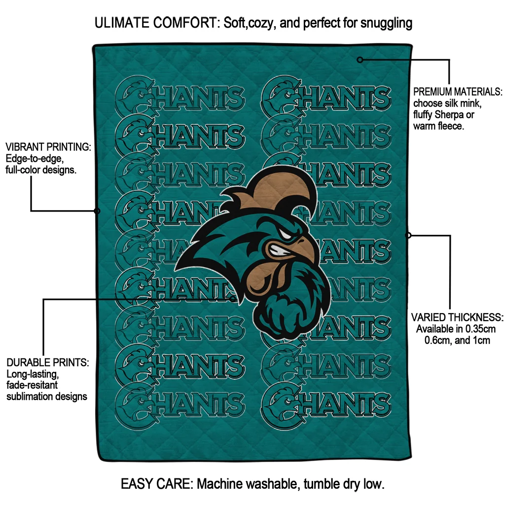 Wrap yourself in warmth and pride with the Coastal Carolina Chanticleers Bold Red Green Quilt Blanket from the Coastal Carolina Chanticleers Blankets collection at Yes That Blanket. Made from 100% premium quilting-weight polyester blended with a touch of microfiber, this quilt offers a smooth, soft finish you’ll love. Choose between two quilting styles—Stipple or Diagonal—and enjoy the comfort of a cotton-filled layer inside that adds extra coziness for every season. The border is available in classic black or white, giving your design a clean, timeless edge.