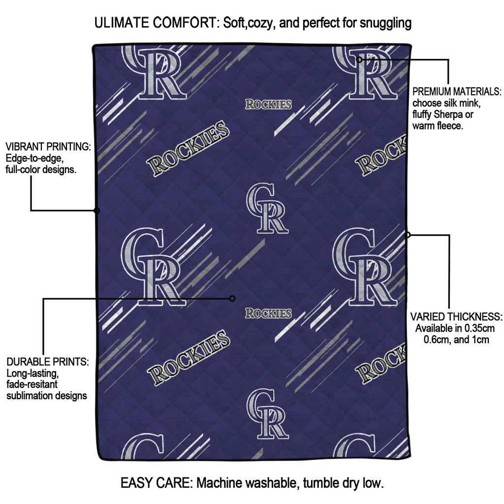 Wrap yourself in warmth and pride with the Colorado Rockies Sketch Lines Blue Quilt Blanket from the Colorado Rockies Blankets collection at Yes That Blanket. Made from 100% premium quilting-weight polyester blended with a touch of microfiber, this quilt offers a smooth, soft finish you’ll love. Choose between two quilting styles—Stipple or Diagonal—and enjoy the comfort of a cotton-filled layer inside that adds extra coziness for every season. The border is available in classic black or white, giving your design a clean, timeless edge.
