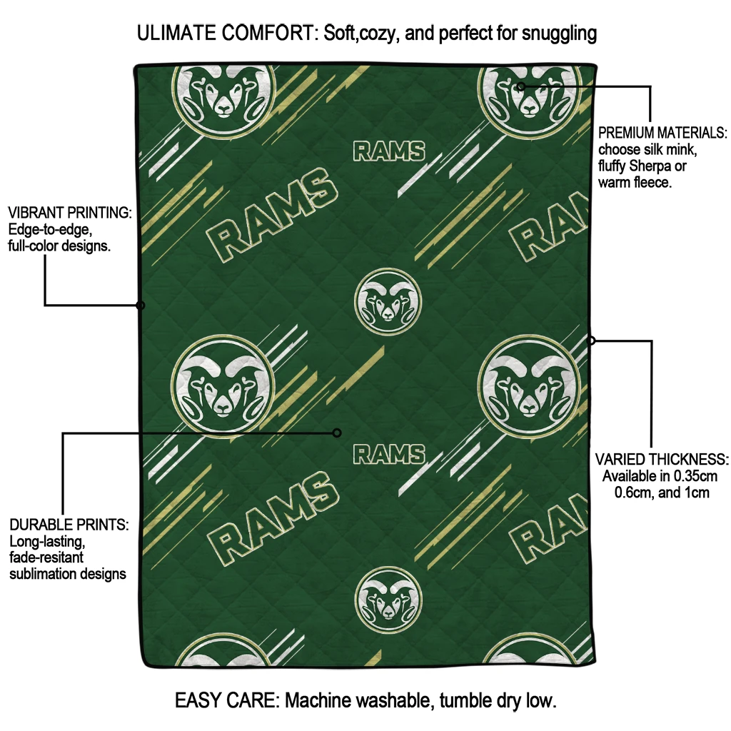 Wrap yourself in warmth and pride with the Colorado State Rams Sketch Lines Green Quilt Blanket from the Colorado State Rams Blankets collection at Yes That Blanket. Made from 100% premium quilting-weight polyester blended with a touch of microfiber, this quilt offers a smooth, soft finish you’ll love. Choose between two quilting styles—Stipple or Diagonal—and enjoy the comfort of a cotton-filled layer inside that adds extra coziness for every season. The border is available in classic black or white, giving your design a clean, timeless edge.