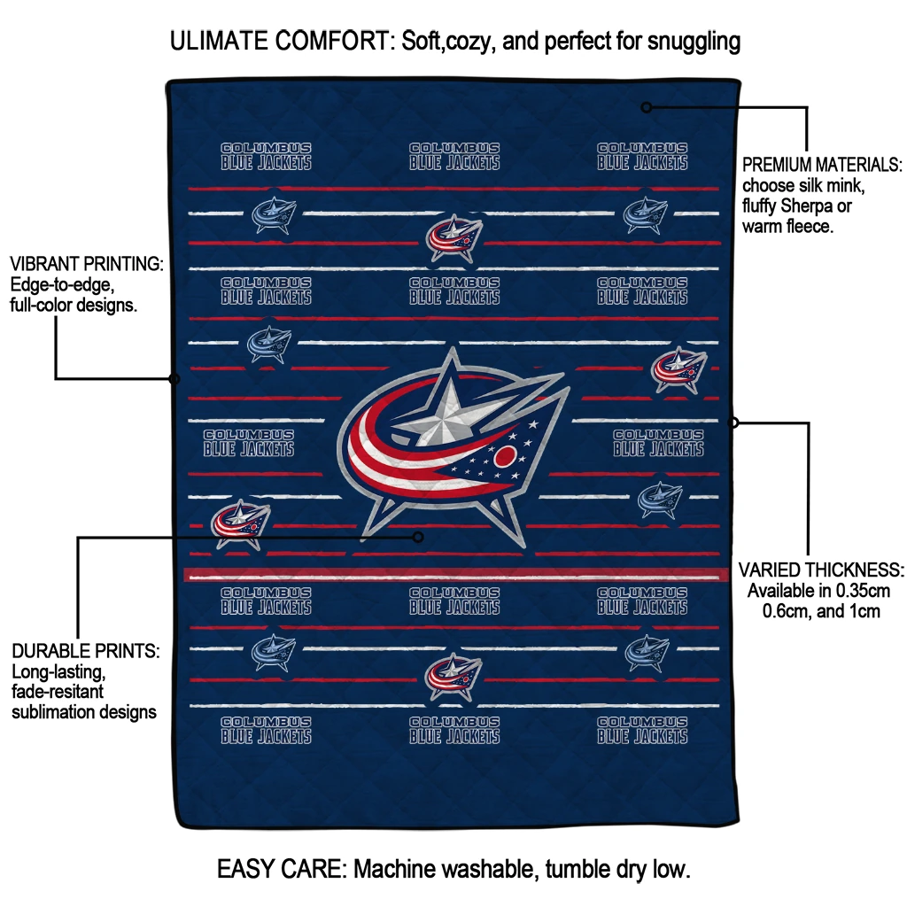 The Columbus Blue Jackets Handdrawn Stripes Navy Blue Quilt Blanket is more than a blanket—it’s everyday comfort, thoughtfully made. Crafted from premium quilting fabric with a soft microfiber touch, it offers a smooth hand-feel and lasting coziness. Layered quilting with a cotton-filled core provides adaptable warmth across seasons while maintaining a clean, tailored look on your bed or sofa.