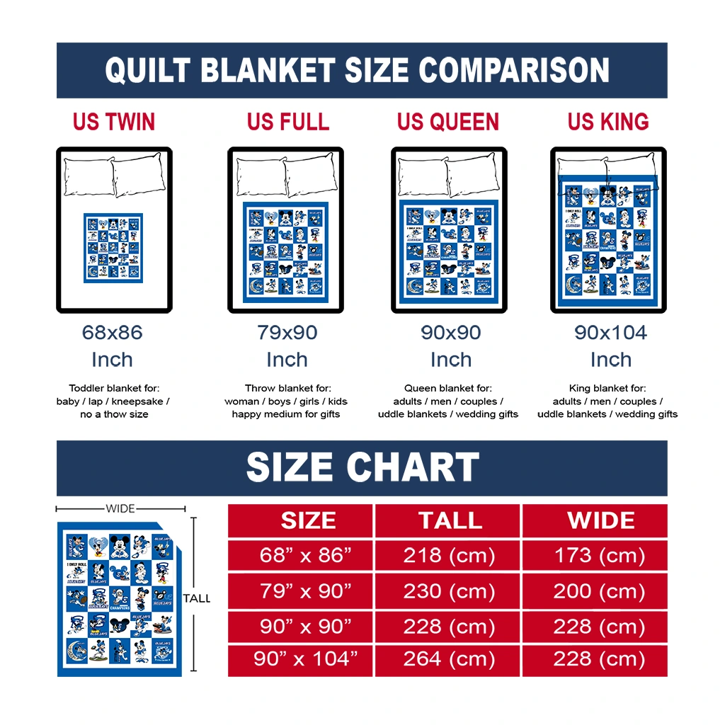 Wrap yourself in warmth and pride with the Creighton Bluejays Mickey Mouse Motif Blue White Quilt Blanket from the Creighton Bluejays Blankets collection at Yes That Blanket. Made from 100% premium quilting-weight polyester blended with a touch of microfiber, this quilt offers a smooth, soft finish you’ll love. Choose between two quilting styles—Stipple or Diagonal—and enjoy the comfort of a cotton-filled layer inside that adds extra coziness for every season. The border is available in classic black or white, giving your design a clean, timeless edge.