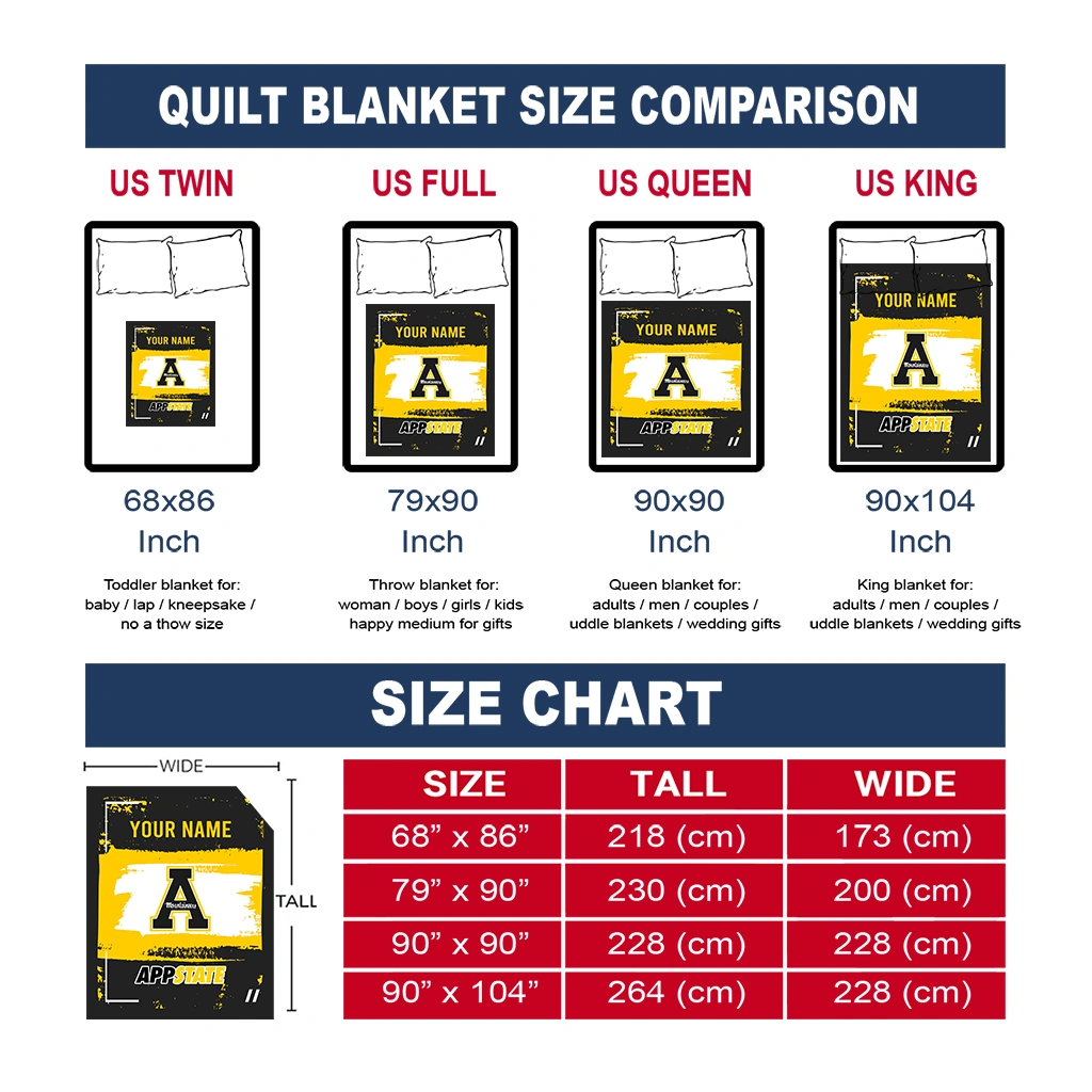 Wrap yourself in warmth and pride with the Custom Appalachian State Mountaineers Grunge Patch Black White Quilt Blanket from the Appalachian State Mountaineers Blankets collection at Yes That Blanket. Made from 100% premium quilting-weight polyester blended with a touch of microfiber, this quilt offers a smooth, soft finish you’ll love. Choose between two quilting styles—Stipple or Diagonal—and enjoy the comfort of a cotton-filled layer inside that adds extra coziness for every season. The border is available in classic black or white, giving your design a clean, timeless edge.