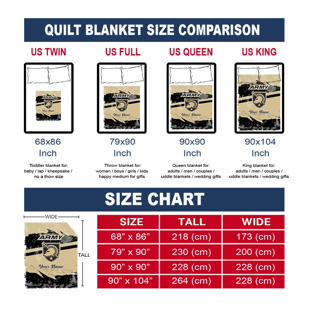 The Custom Army Black Knights Brushstroke Layers Gold Quilt Blanket is more than a blanket—it’s everyday comfort, thoughtfully made. Crafted from premium quilting fabric with a soft microfiber touch, it offers a smooth hand-feel and lasting coziness. Layered quilting with a cotton-filled core provides adaptable warmth across seasons while maintaining a clean, tailored look on your bed or sofa.