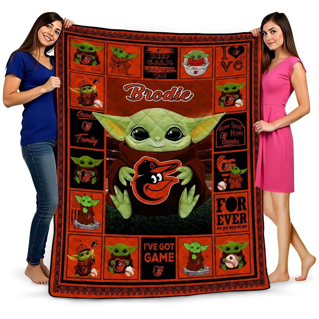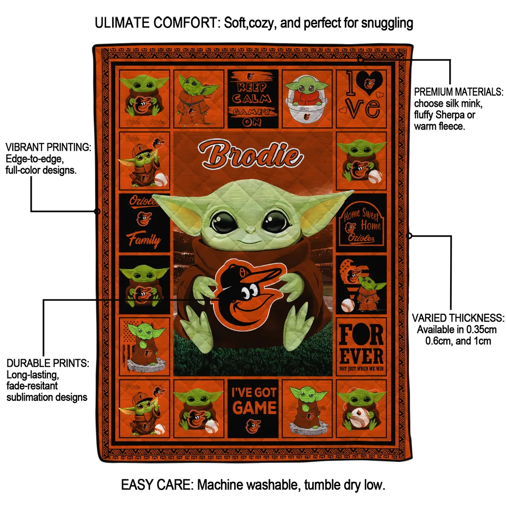 The Custom Baltimore Orioles Yody Baby Motif Orange Quilt Blanket is more than a blanket—it’s everyday comfort, thoughtfully made. Crafted from premium quilting fabric with a soft microfiber touch, it offers a smooth hand-feel and lasting coziness. Layered quilting with a cotton-filled core provides adaptable warmth across seasons while maintaining a clean, tailored look on your bed or sofa.