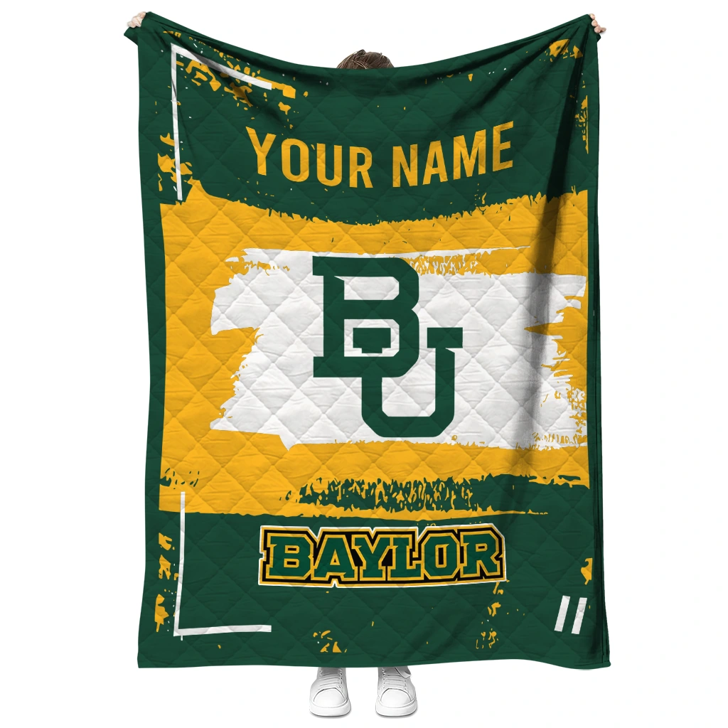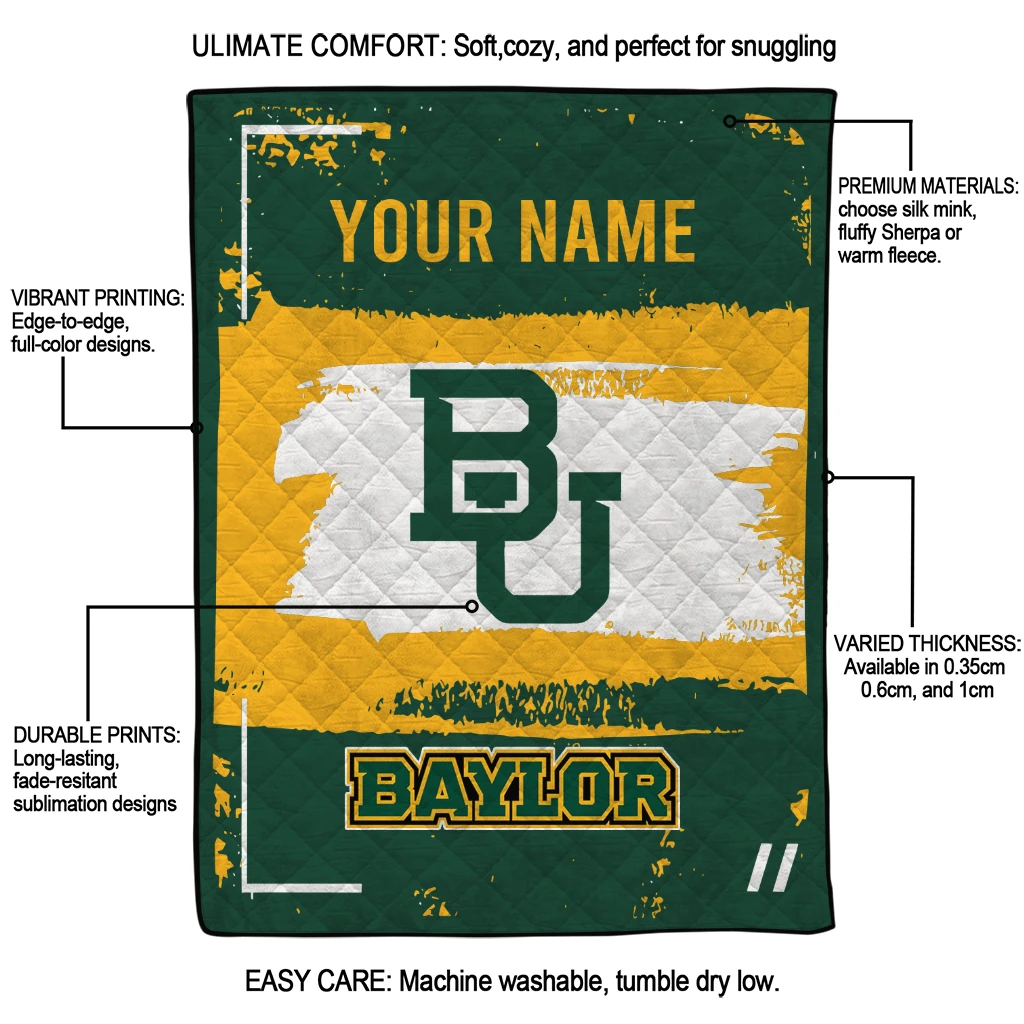 Wrap yourself in warmth and pride with the Custom Baylor Bears Grunge Patch Green White Quilt Blanket from the Baylor Bears Blankets collection at Yes That Blanket. Made from 100% premium quilting-weight polyester blended with a touch of microfiber, this quilt offers a smooth, soft finish you’ll love. Choose between two quilting styles—Stipple or Diagonal—and enjoy the comfort of a cotton-filled layer inside that adds extra coziness for every season. The border is available in classic black or white, giving your design a clean, timeless edge.